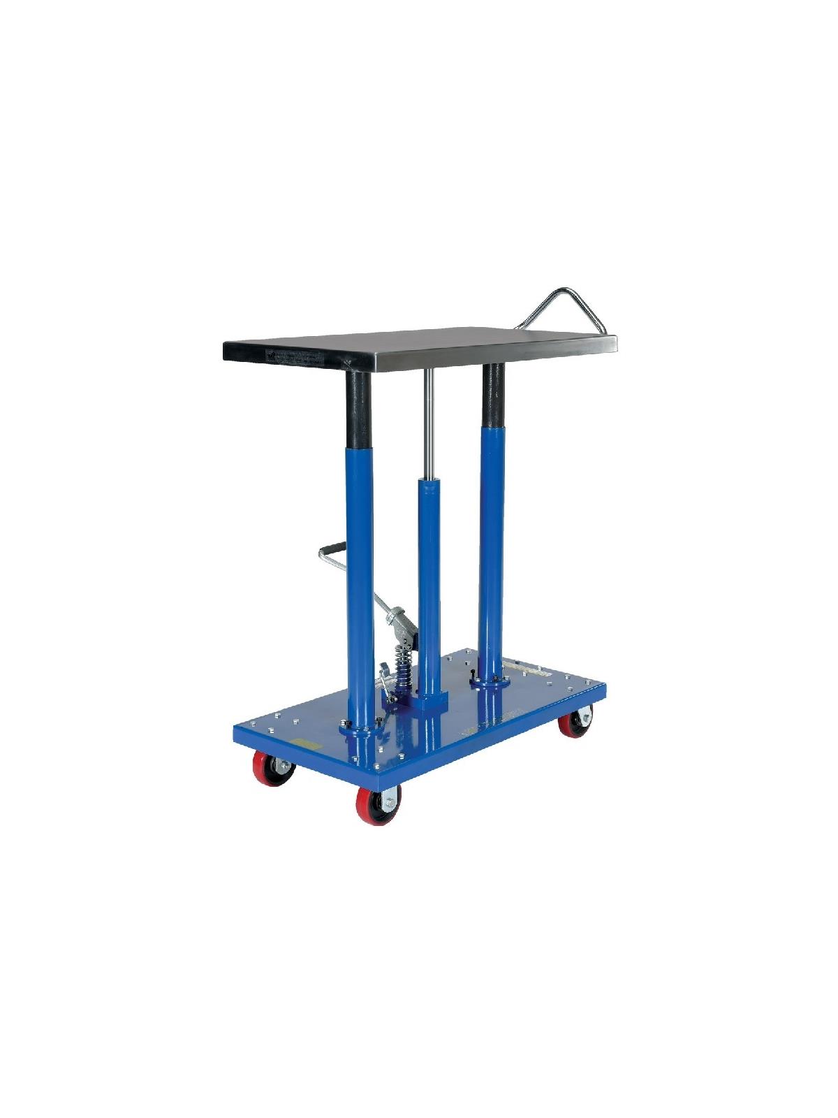 Hydraulic center post lifts tabletop with rigidity. Models with corner posts are telescoping to help stabilize and fully support the load during operation. Rolls smoothly on durable heavy duty casters. FOB Shipping Point.