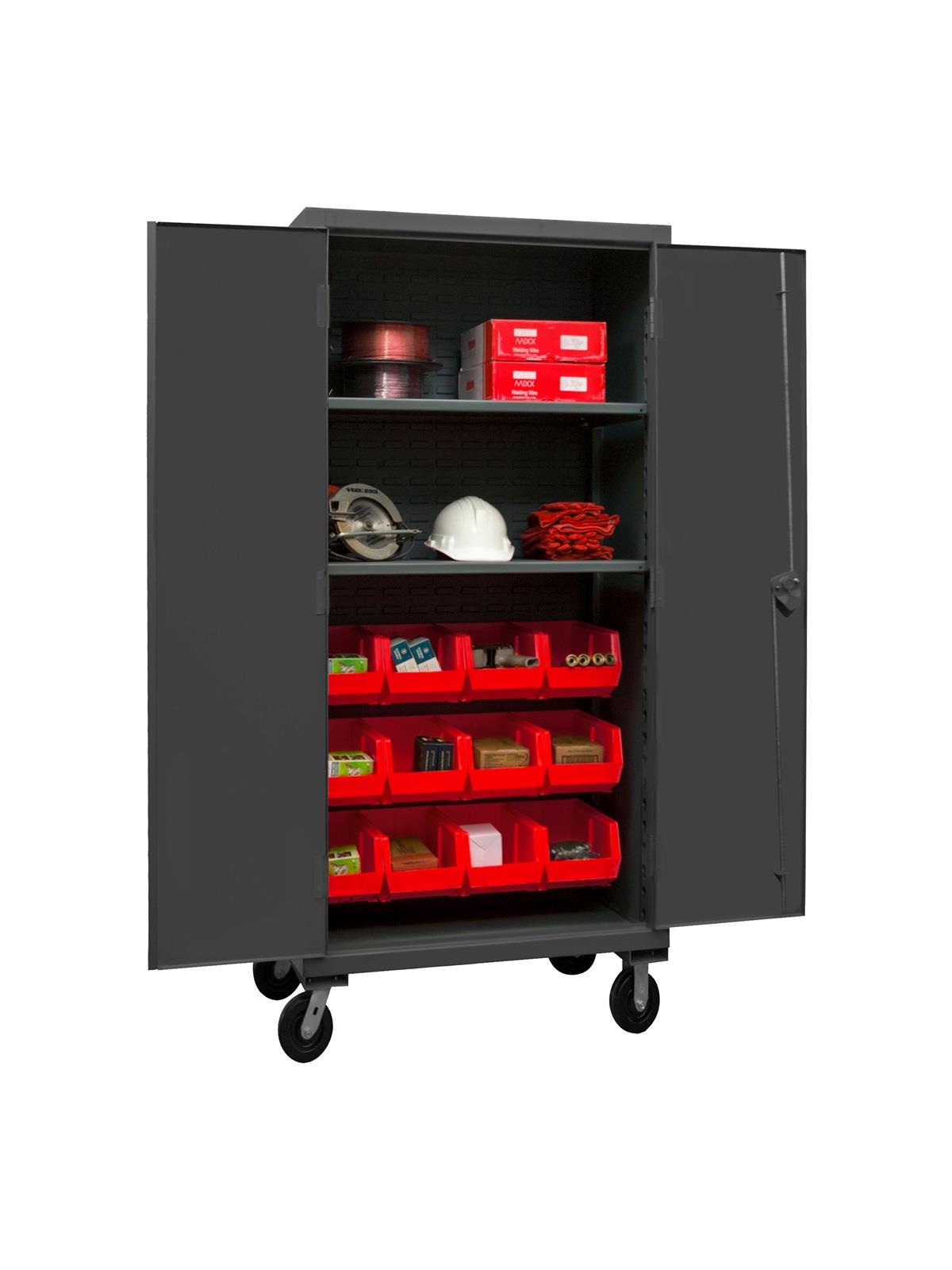 Heavy duty, all welded 12-gauge steel with 6" x 2" phenolic casters (2 rigid, 2 locking swivel). 3-point locking system with keyed handle and lock rods, 4 keys included. Side handle for easy maneuvering. Fully welded louvered panels reinforce back and hold Hook-On-Bins®. Shelves bolt into place easily using fasteners provided and adjust on 2-1/4" centers. No tools required for installation.  Hook-On-Bins® by Durham are included and install with no tools required. Gray textured powder coat finish. Available in three bin colors, Red (-1795), Blue (-5295), or Yellow (-95). FOB Shipping Point.