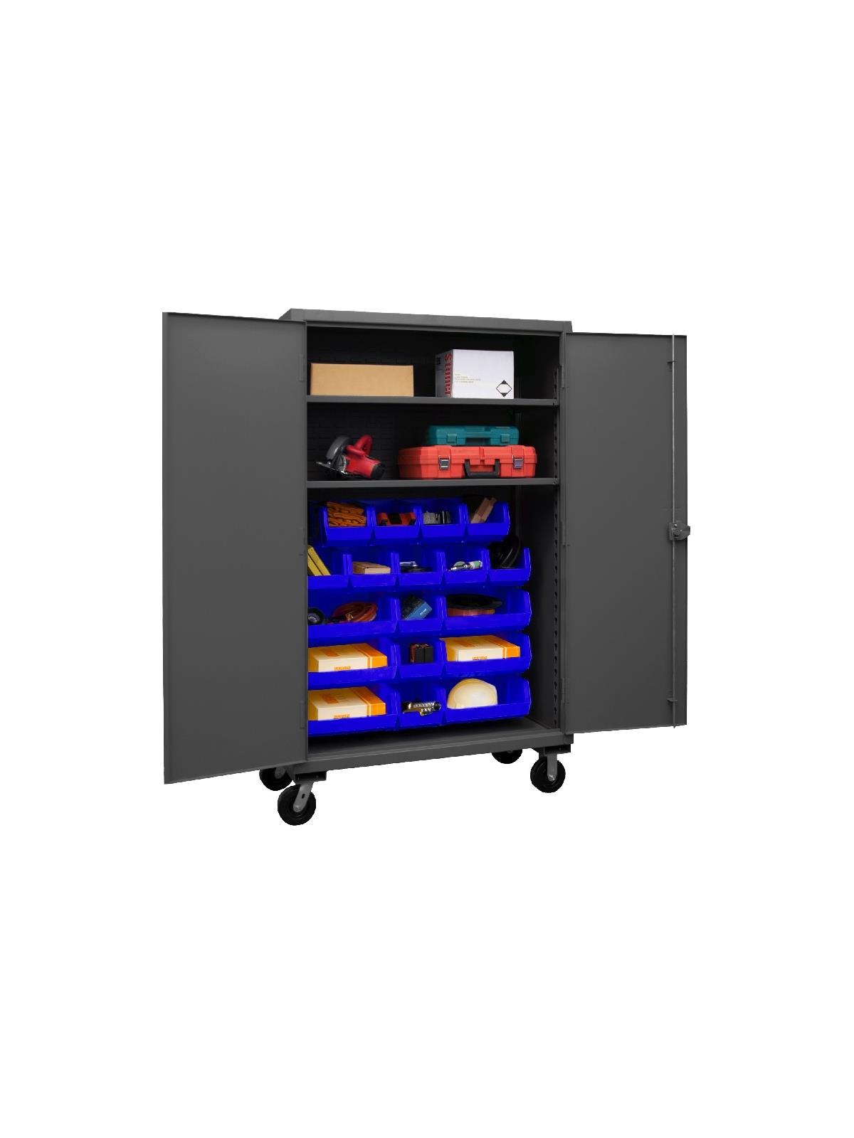 Heavy duty, all welded 12-gauge steel with 6" x 2" phenolic casters (2 rigid, 2 locking swivel). 3-point locking system with keyed handle and lock rods, 4 keys included. Side handle for easy maneuvering. Fully welded louvered panels reinforce back and hold Hook-On-Bins®. Shelves bolt into place easily using fasteners provided and adjust on 2-1/4" centers. No tools required for installation.  Hook-On-Bins® by Durham are included and install with no tools required. Gray textured powder coat finish. Available in three bin colors, Red (-1795), Blue (-5295), or Yellow (-95). FOB Shipping Point.