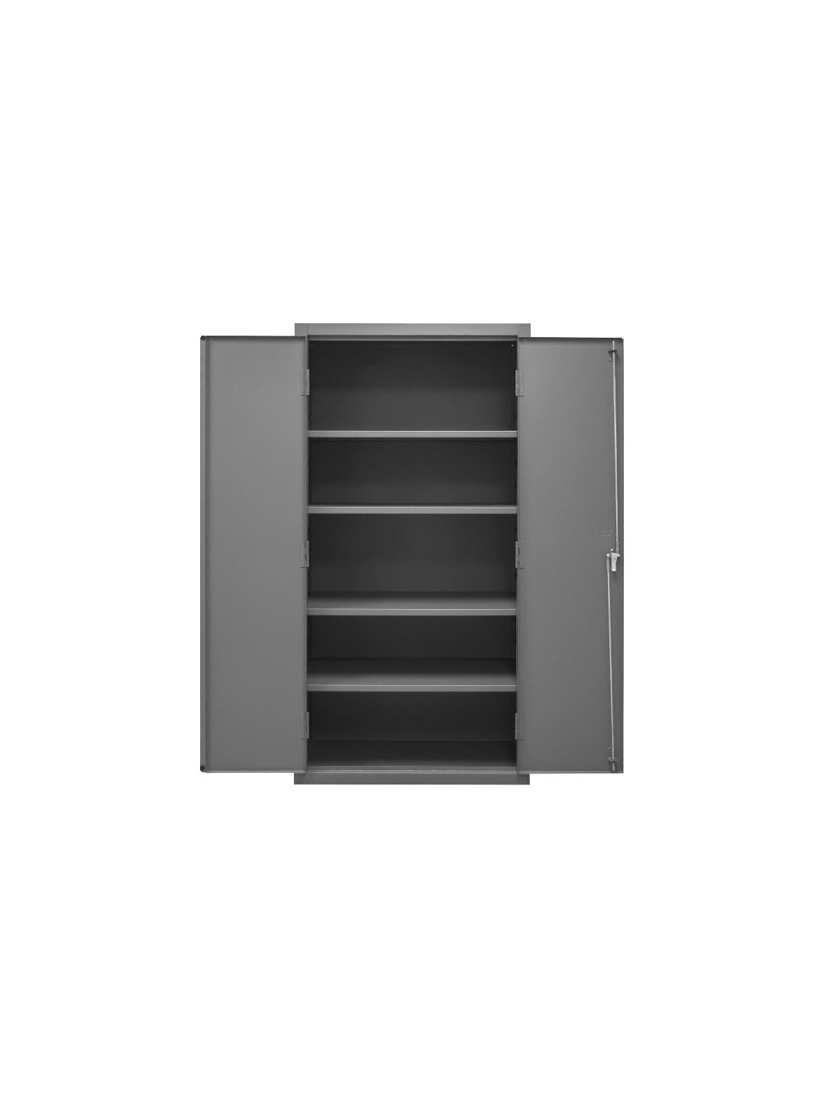 Industrial duty, all welded 16-gauge steel with 3-point locking system with keyed handle and lock rods, 4 keys included. Adjustable shelves rest on louvered panels and adjust on 4" centers. No tools required for installation. H2505 & H2506 models have 6"H base/legs which provide access for forklifts, pre-punched holes allow for lagging to the floor. (Constructed of 3/16" steel) Gray, textured powder coat finish. FOB Shipping Point.