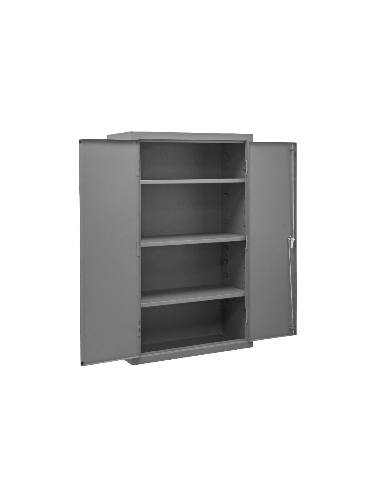 Industrial duty, all welded 16-gauge steel with 3-point locking system with keyed handle and lock rods, 4 keys included. Adjustable shelves rest on louvered panels and adjust on 4" centers. No tools required for installation. H2505 & H2506 models have 6"H base/legs which provide access for forklifts, pre-punched holes allow for lagging to the floor. (Constructed of 3/16" steel) Gray, textured powder coat finish. FOB Shipping Point.