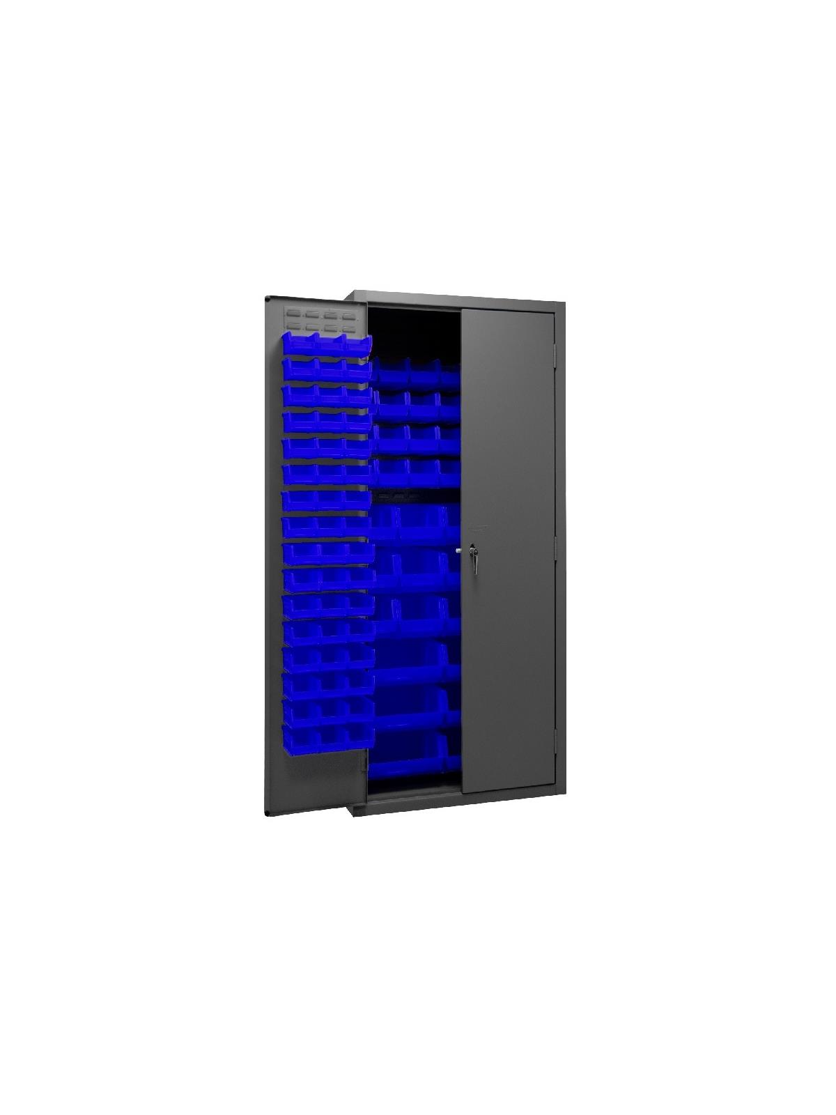 3-point locking system with keyed handle and lock rods, 4 keys included. Full height, formed and recessed doors with heavy duty, leaf hinges to prevent sagging and warping. Fully welded louvered panels reinforce door and accommodates Hook-On-Bins®. Hook-On-Bins® installed easily with no tools required. Hook-On-Bins® are included. Durable, gray textured powder coat finish. Available in three bin colors, Red (-1795), Blue (-5295), or Yellow (-95). FOB Shipping Point.