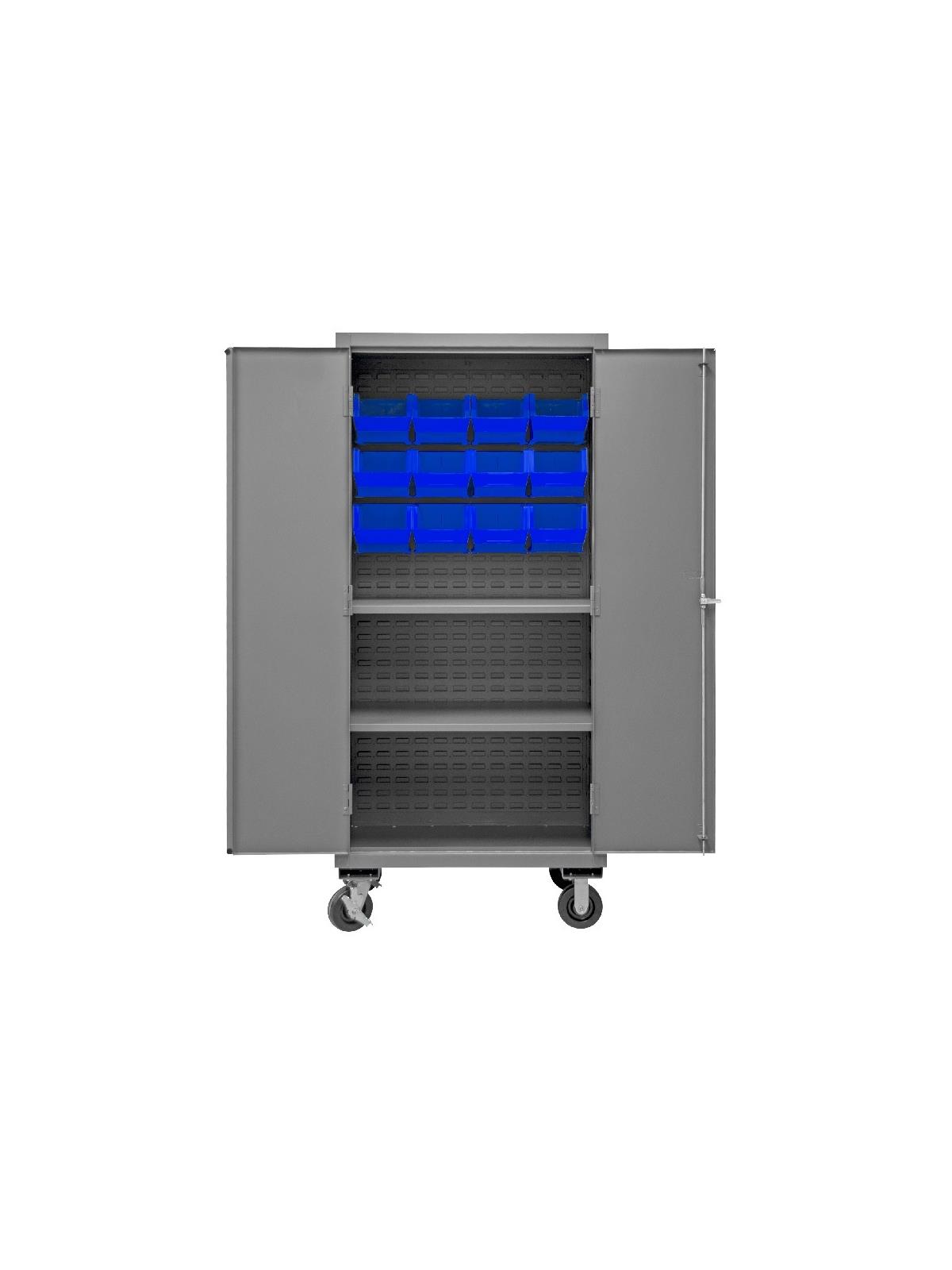 Industrial duty, all welded 16-gauge steel with 6" x 2" phenolic casters (2 rigid, 2 locking swivel). 3-point locking system with keyed handle and lock rods, 4 keys included. Side handle for easy maneuvering. Fully welded louvered panels reinforce back and hold Hook-On-Bins® and adjustable shelves rest on louvered panels and adjust on 4" centers. No tools required for installation. Hook-On-Bins® by Durham are included and install with no tools required. Gray textured powder coat finish. Available in three bin colors, Red (-1795), Blue (-5295), or Yellow (-95). FOB Shipping Point.