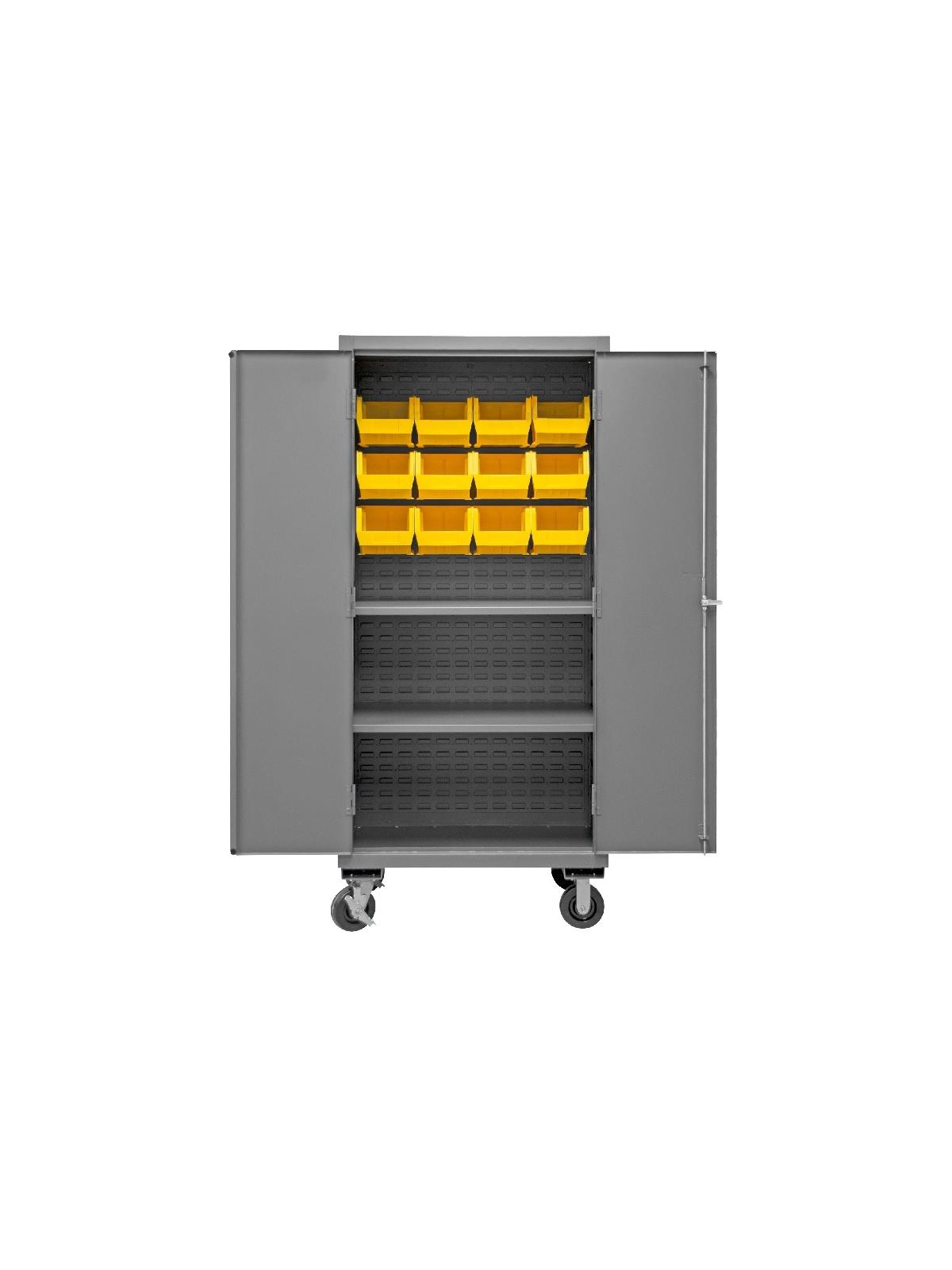 Industrial duty, all welded 16-gauge steel with 6" x 2" phenolic casters (2 rigid, 2 locking swivel). 3-point locking system with keyed handle and lock rods, 4 keys included. Side handle for easy maneuvering. Fully welded louvered panels reinforce back and hold Hook-On-Bins® and adjustable shelves rest on louvered panels and adjust on 4" centers. No tools required for installation. Hook-On-Bins® by Durham are included and install with no tools required. Gray textured powder coat finish. Available in three bin colors, Red (-1795), Blue (-5295), or Yellow (-95). FOB Shipping Point.