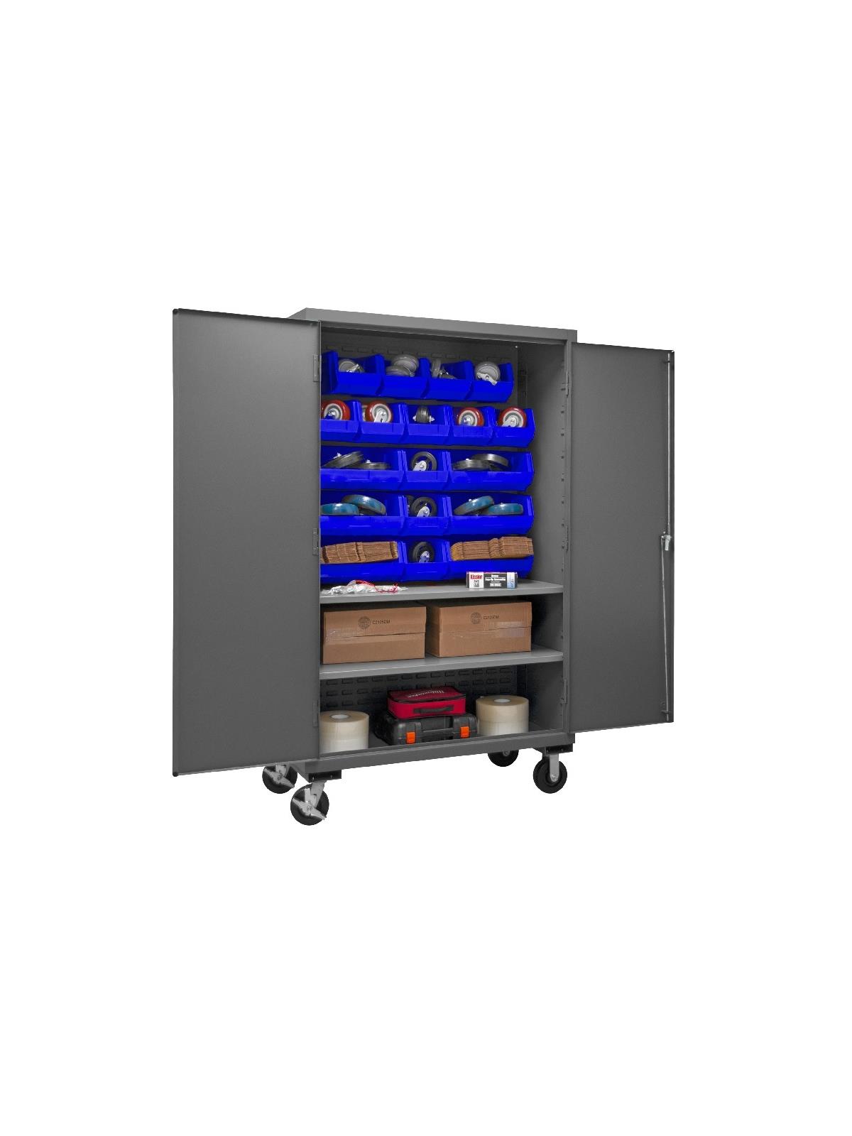 Industrial duty, all welded 16-gauge steel with 6" x 2" phenolic casters (2 rigid, 2 locking swivel). 3-point locking system with keyed handle and lock rods, 4 keys included. Side handle for easy maneuvering. Fully welded louvered panels reinforce back and hold Hook-On-Bins® and adjustable shelves rest on louvered panels and adjust on 4" centers. No tools required for installation. Hook-On-Bins® by Durham are included and install with no tools required. Gray textured powder coat finish. Available in three bin colors, Red (-1795), Blue (-5295), or Yellow (-95). FOB Shipping Point.
