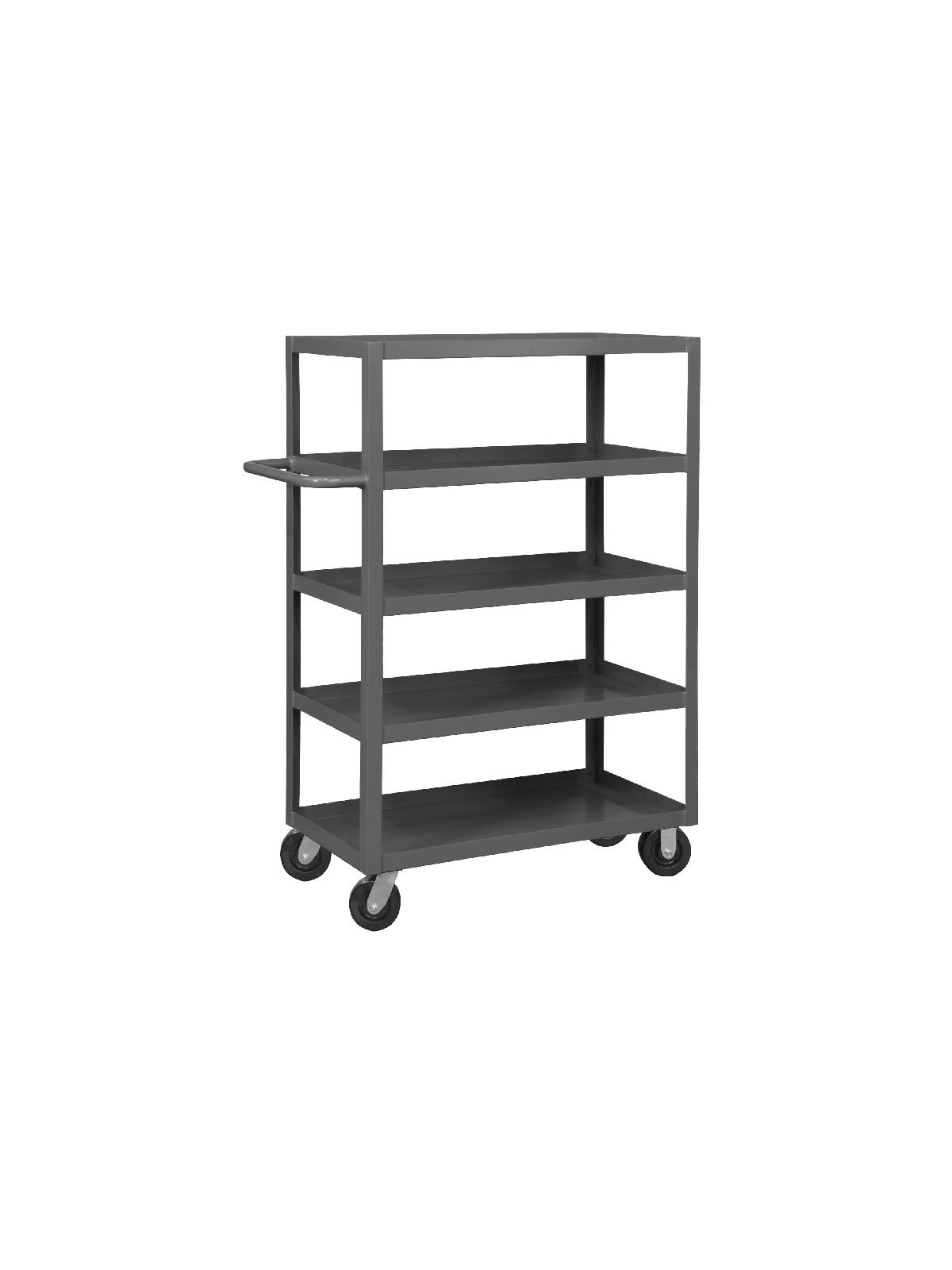 Shelf carts are constructed with 1-1/2" x 1/8" angle iron uprights for added strength. Heavy duty 14 gauge steel shelves. Sturdy tubular push handle. Perfect for transporting heavier parts or stock items. Shelf Stock Carts are available in 1,200 lbs. or 3,000 lbs. capacities. FOB Shipping Point.