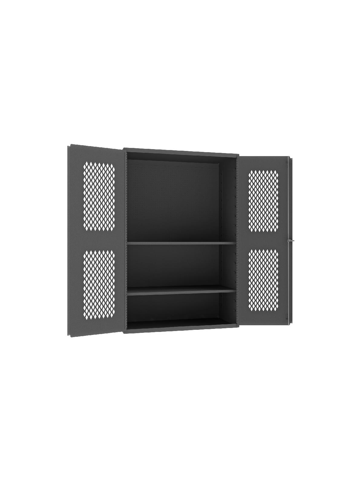 Large storage cabinets have heavy-duty leaf hinges to prevent warping and sagging. H3501-DLP-PB-96-2S-95 features louvered panels on doors to allow for bin storage of small parts and HEMDC-482472-PB-2S-95 features punched diamond pattern on doors for visibility and ventilation. Cabinets have two shelves that adjust on 4" centers - no tools required - and hold up to 700-1250 lbs. (weight evenly distributed) and feature a 3-point locking system with keyed handle and 5/16" dia. lock rods. Available in Gray powder coat finish. Ships fully assembled. FOB Shipping Point.