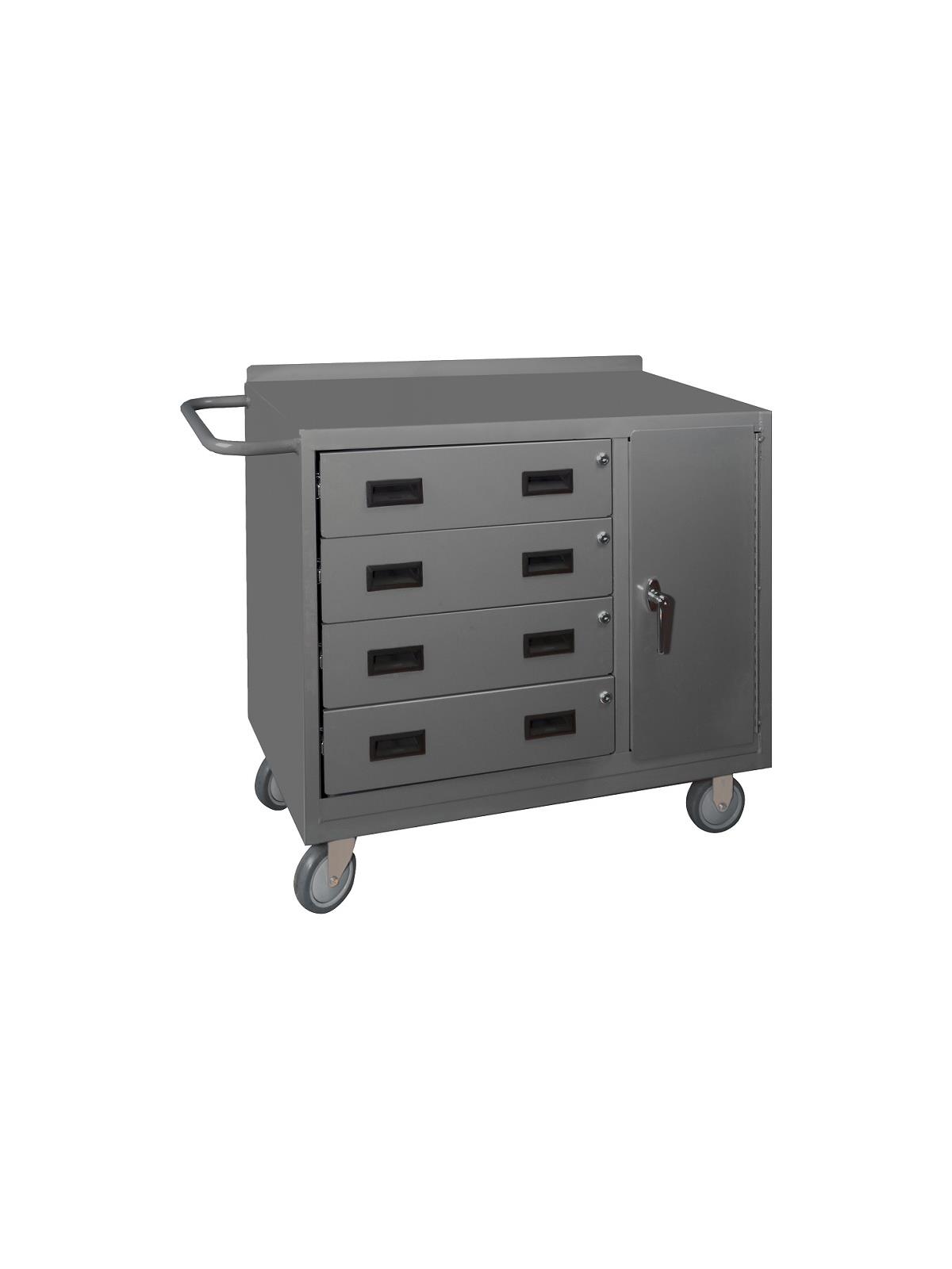 Smooth ball bearing slide drawers are complete with recessed pull handle and cylinder lock. These cabinets deliver top quality without a top price. Easy swing doors on full piano hinge and single point locking handles. Drawers measure 20-7/16"W x 14-11/16"D x 5-7/8"H. Rolls on 5" polyurethane casters (2 rigid, 2 swivel). Complete with push handle. HEMC models have 3"H. back stop. Supplied with keyed-alike cylinder locks. Gray powder coat finish. FOB Shipping Point.