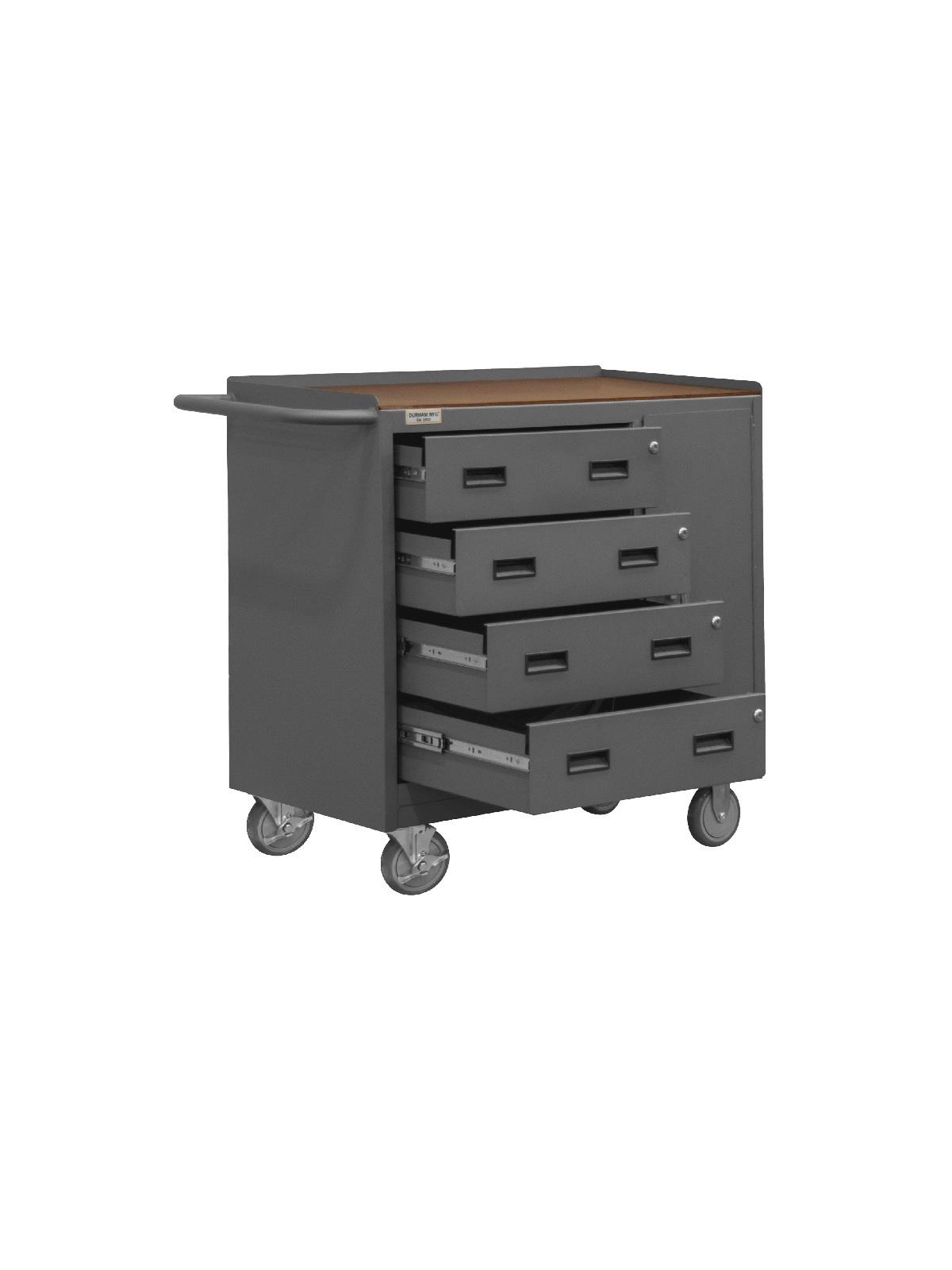 Bench cabinets are constructed of 14 gauge steel. Convenient sturdy work surface with back and end stops on the work surface prevents parts from falling off during transport (MT units not included). Tubular handle for easy maneuverability. Cabinet doors have a 3 point locking system with 4 keys. Rolls smoothly on 5" polyurethane bolt-on casters, (2) swivel with side brakes and (2) rigid. 36"W model has 1,200 lbs. capacity. 48"W model has 2,000 lbs. capacity and includes a floor lock to keep the unit in place while you work. FOB Shipping Point.