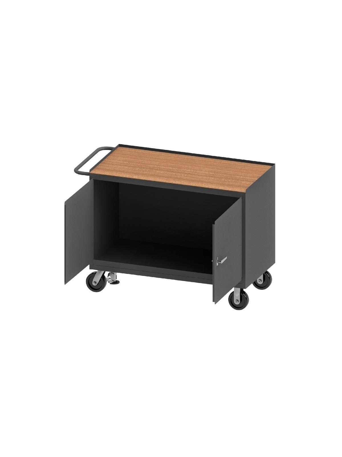 Bench cabinets are constructed of 14 gauge steel. Convenient sturdy work surface with back and end stops on the work surface prevents parts from falling off during transport (MT units not included). Tubular handle for easy maneuverability. Cabinet doors have a 3 point locking system with 4 keys. Rolls smoothly on 5" polyurethane bolt-on casters, (2) swivel with side brakes and (2) rigid. 36"W model has 1,200 lbs. capacity. 48"W model has 2,000 lbs. capacity and includes a floor lock to keep the unit in place while you work. FOB Shipping Point.
