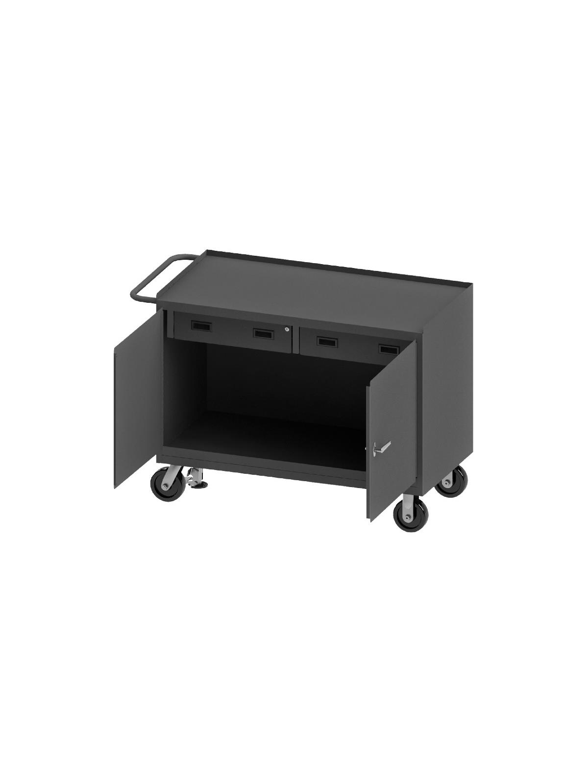 Bench cabinets are constructed of 14 gauge steel. Convenient sturdy work surface with back and end stops on the work surface prevents parts from falling off during transport (MT units not included). Tubular handle for easy maneuverability. Cabinet doors have a 3 point locking system with 4 keys. Rolls smoothly on 5" polyurethane bolt-on casters, (2) swivel with side brakes and (2) rigid. 36"W model has 1,200 lbs. capacity. 48"W model has 2,000 lbs. capacity and includes a floor lock to keep the unit in place while you work. FOB Shipping Point.