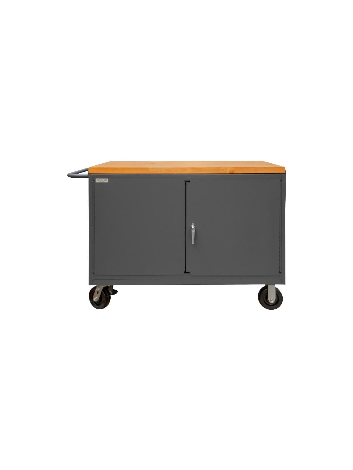 Bench cabinets are constructed of 14 gauge steel. Convenient sturdy work surface with back and end stops on the work surface prevents parts from falling off during transport (MT units not included). Tubular handle for easy maneuverability. Cabinet doors have a 3 point locking system with 4 keys. Rolls smoothly on 5" polyurethane bolt-on casters, (2) swivel with side brakes and (2) rigid. 36"W model has 1,200 lbs. capacity. 48"W model has 2,000 lbs. capacity and includes a floor lock to keep the unit in place while you work. FOB Shipping Point.
