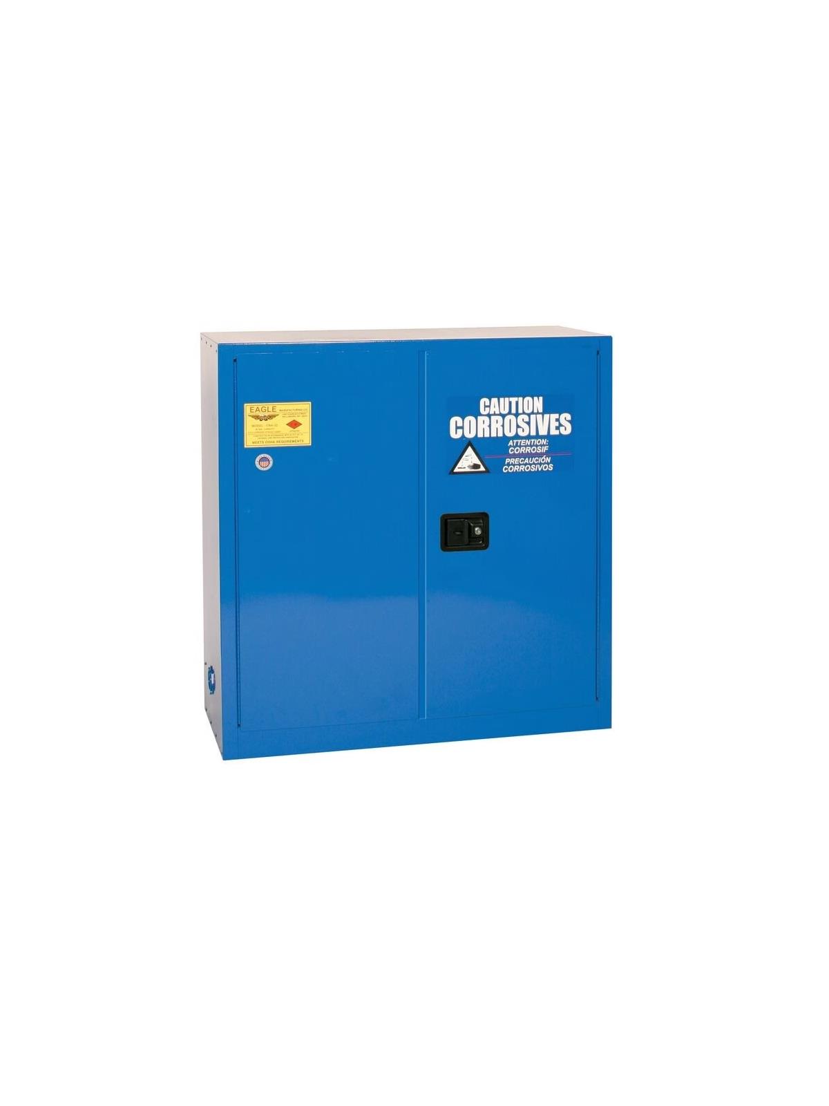 Eagle acid corrosive safety cabinets are constructed of 18-gauge (1mm) steel. They are designed to store small containers of acids and corrosive liquids. All interior and exterior cabinet walls are finished with blue epoxy powder coating for superior protection against chemical corrosion. Each cabinet has high-density polyethylene (HDPE) trays for the shelves, adjustable poly shelves, storage for smaller containers in the doors, lockable doors, internal and top sump capacities, and poly vents with caps. Most of the corrosive safety cabinets are FM approved. FOB Shipping Point.