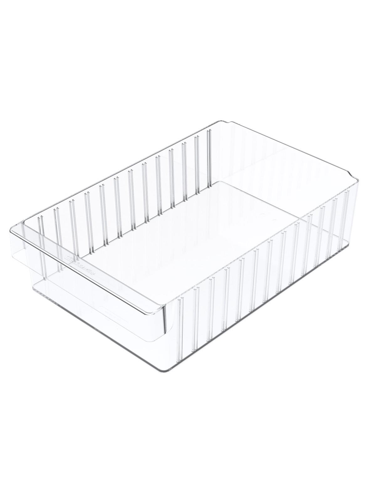 Offered in 12" or 18" depths to work with compatible shelving. Easy to label and color code inventory for quick identification of parts and supplies. Drawers can be stacked to optimize space. Wide front handle for easy gripping when AkroDrawers are loaded or contain heavy contents. Can be used with available shelving, racks, mobile carts or can be used by themselves. Sturdy back stop tab ensures AkroDrawers can hang securely from shelves. Dividers are available to keep contents neatly separated in drawers. Available in Blue, Gray, Yellow, Red and Clear - Minimum order required. FOB Shipping Point.
