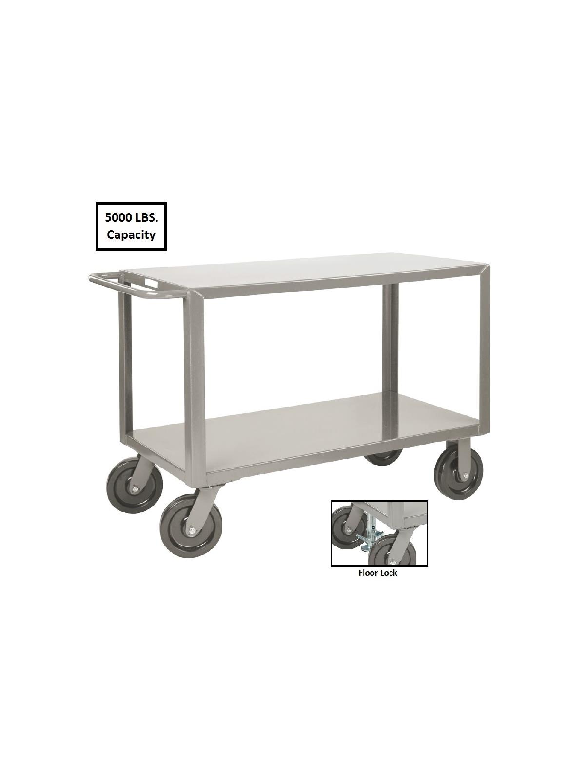 Easy mobility with durability. All welded construction features 12 ga. steel flush shelves with extra reinforcements. Handles loads up to 5000 lbs. Top shelf is 36" above ground with 23" clearance between shelves. More maneuverable with 2 rigid, 2 swivel heavy duty 8" phenolic kingpinless casters. Also available with Floor Lock (-FL added to Product No.). FOB Shipping Point.