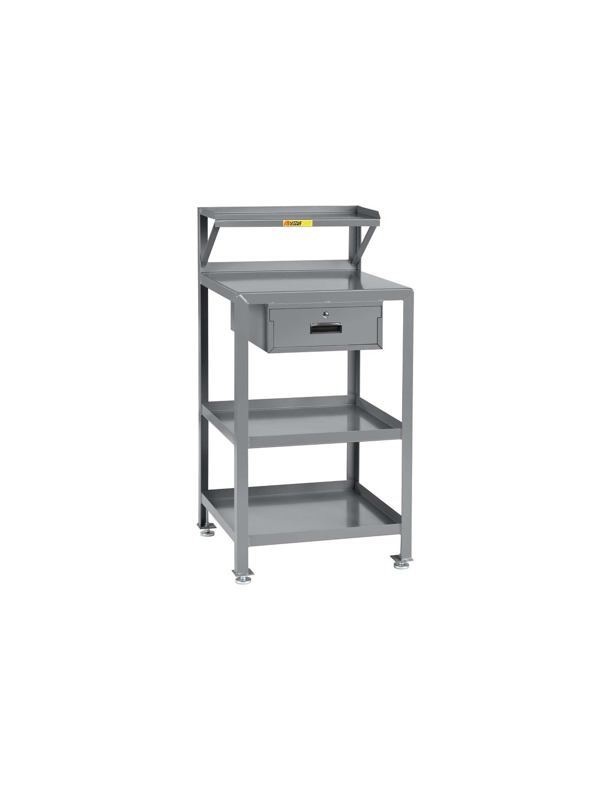 All-welded construction with comfortable height as a standing desk/workstation. Riser shelf is 10" deep and 10" above desk surface. Locking storage drawer is 13"W x 17"D x 4-1/2"H and comes with two keys. Lower shelves have 1-1/2" retaining lips and 11-3/4" shelf clearance. FOB Shipping Point.
