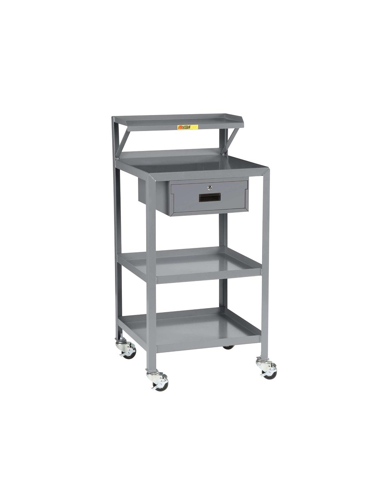 All-welded construction with comfortable height as a standing desk/workstation. Riser shelf is 10" deep and 10" above desk surface. Locking storage drawer is 13"W x 17"D x 4-1/2"H and comes with two keys. Lower shelves have 1-1/2" retaining lips and 11-3/4" shelf clearance. FOB Shipping Point.