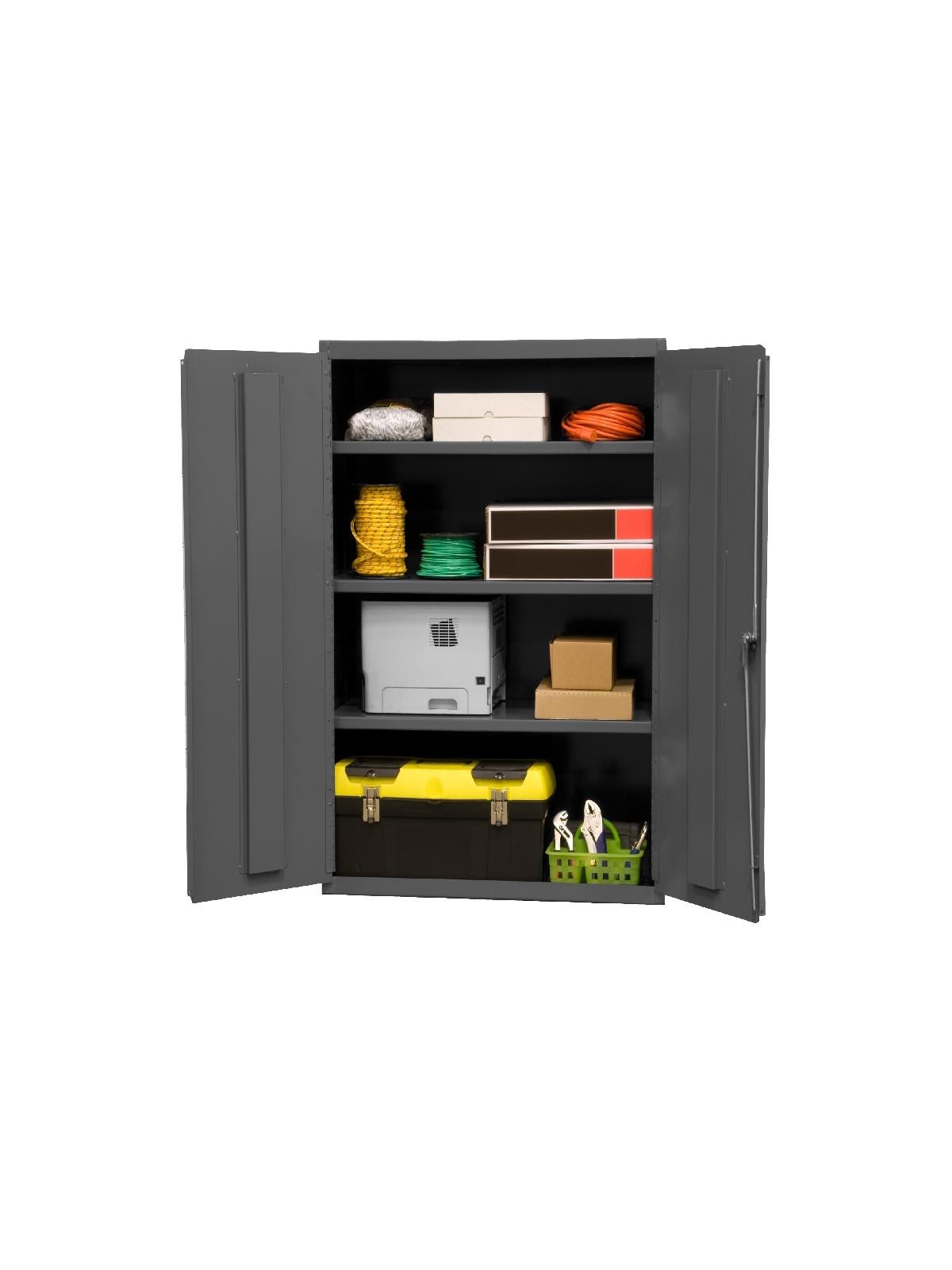 Choose from ten models to store, sort and organize. Construction features not found anywhere else. Ideal for factories, warehouses or offices. Securely store tools, parts and supplies. Doors swing effortlessly. Doors also feature three point locking handle and two keys. Durable gray powder coat finish. FOB Shipping Point.