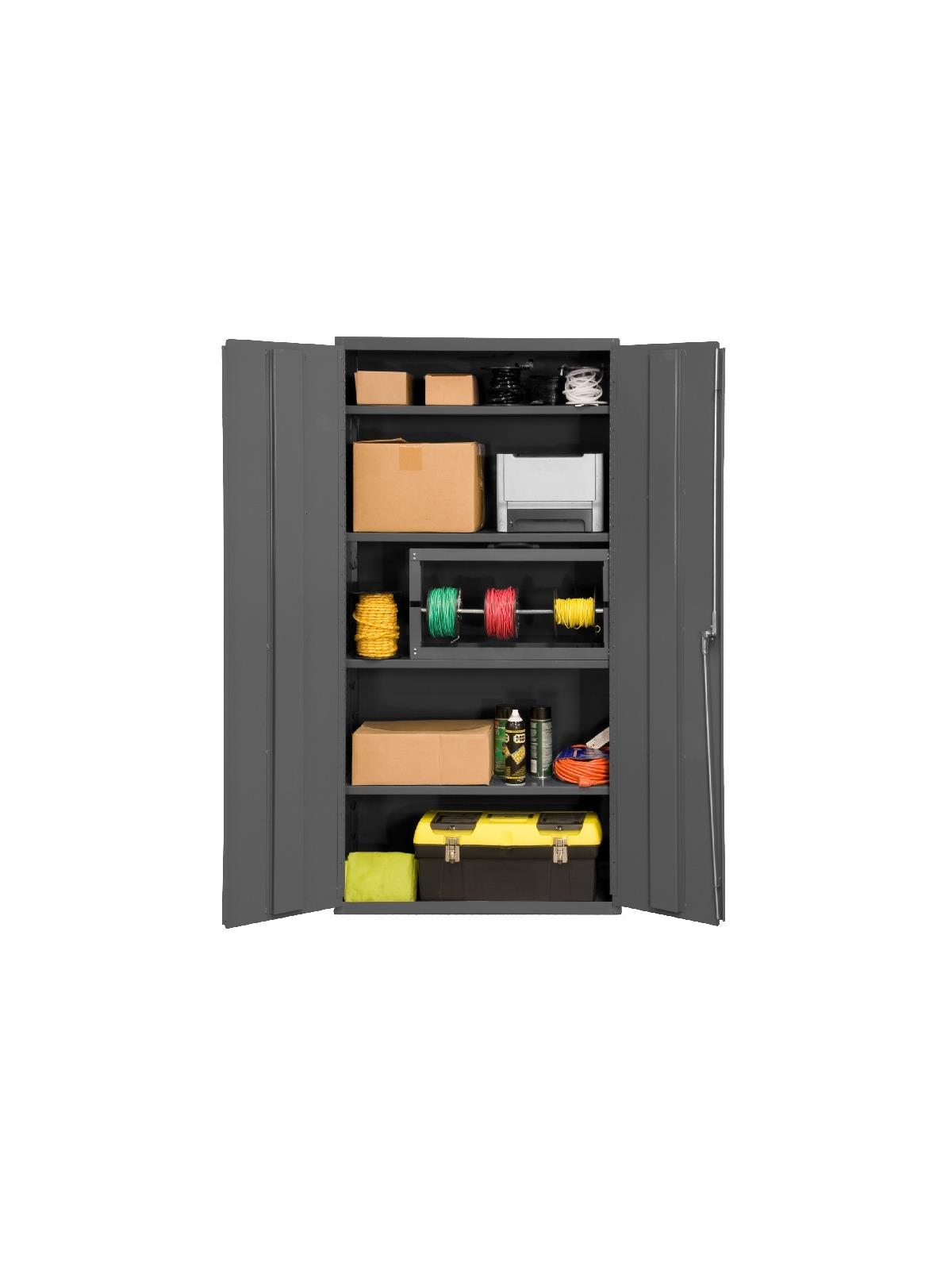 Choose from ten models to store, sort and organize. Construction features not found anywhere else. Ideal for factories, warehouses or offices. Securely store tools, parts and supplies. Doors swing effortlessly. Doors also feature three point locking handle and two keys. Durable gray powder coat finish. FOB Shipping Point.