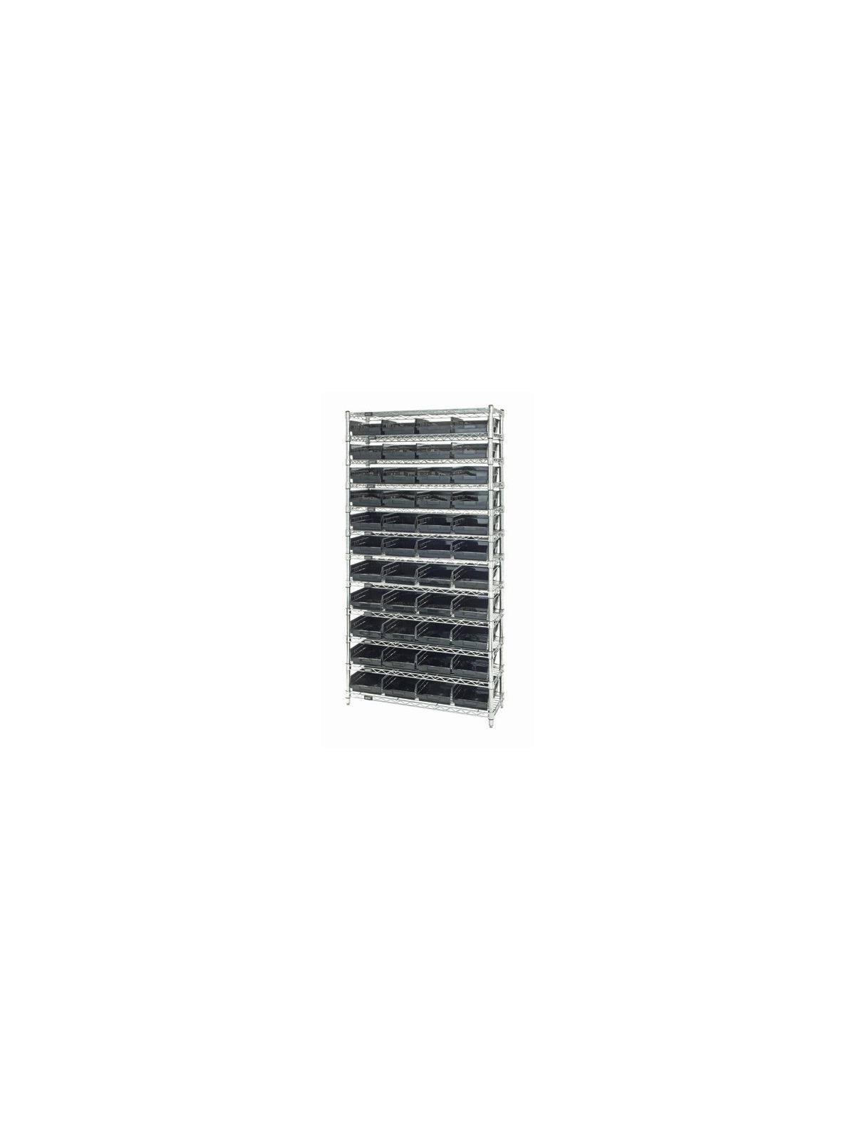 Combine stylish chrome shelving and parts organizing bins. Sturdy shelving unit supports loads up to 800 lbs. Choice of bins. Easy to assemble. Shelf Bins are available in Blue, Red, Yellow, Green, Ivory or Black.  FOB Shipping Point.