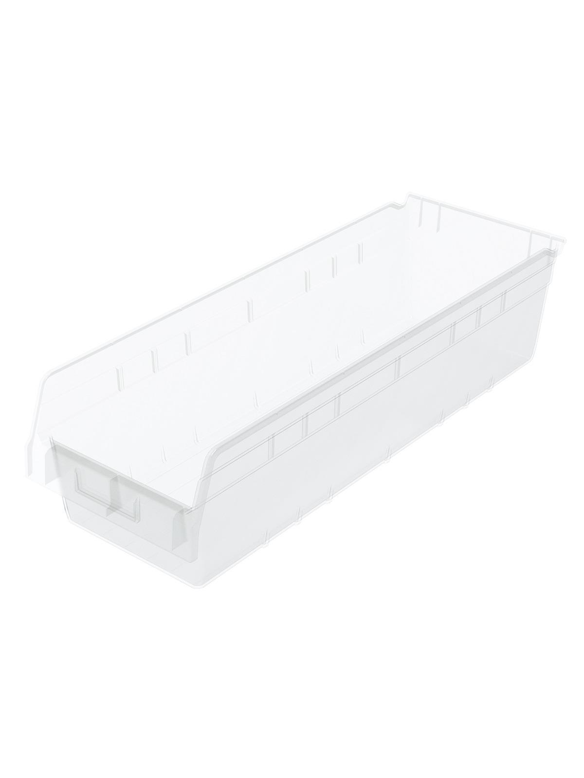 Clear 6" ShelfMax® Bins expand storage capacity up to 85% over standard 4" bins. Rolled top edge for added strength when filled to capacity. Durable clear polypropylene construction. Optional lids and dividers available. FOB Shipping Point.