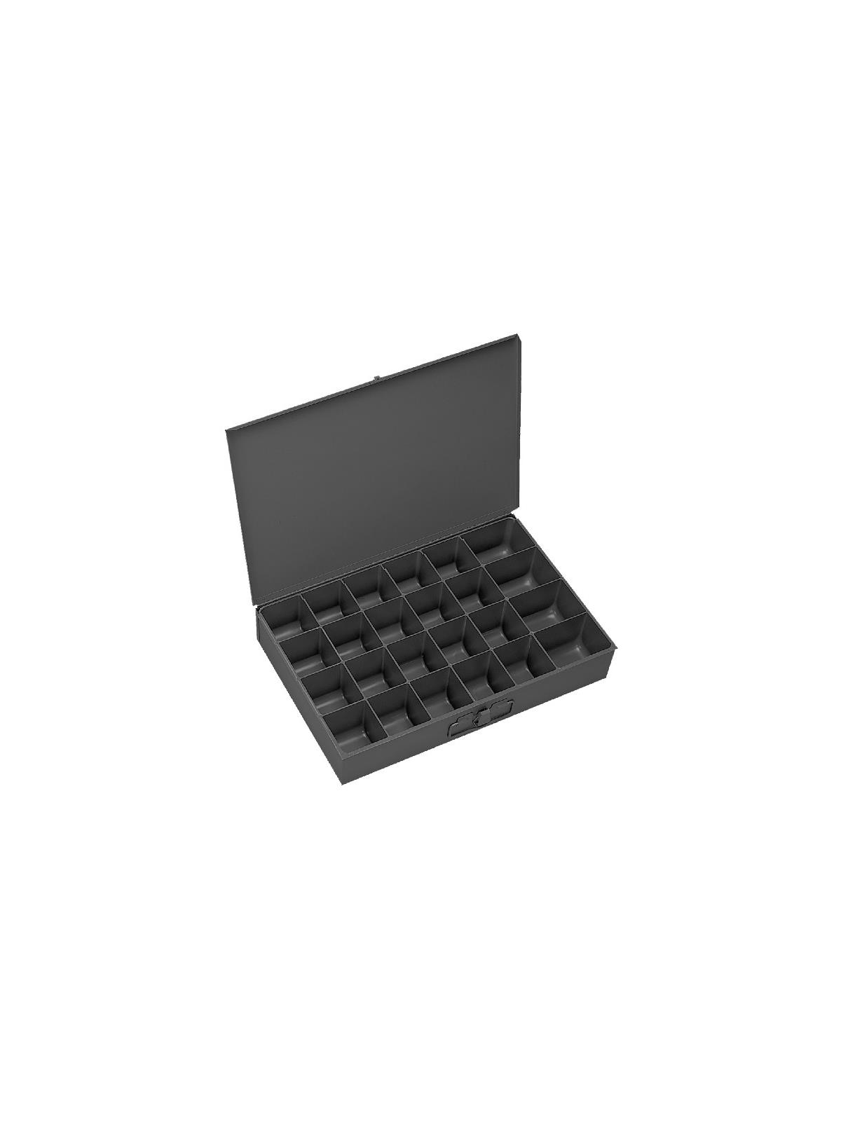 Efficient storage and organization for a variety of parts and components. Each compartment box interior is manufactured of polypropylene with scooped bottoms, both front and back for easy parts removal. Rugged steel, all-welded cabinets are reinforced for rigidity. Use on the workbench, counter or carry to the job site with convenient thumb-grip handles. Finished in acid and rust resistant Gray powder coating. FOB Shipping Point.