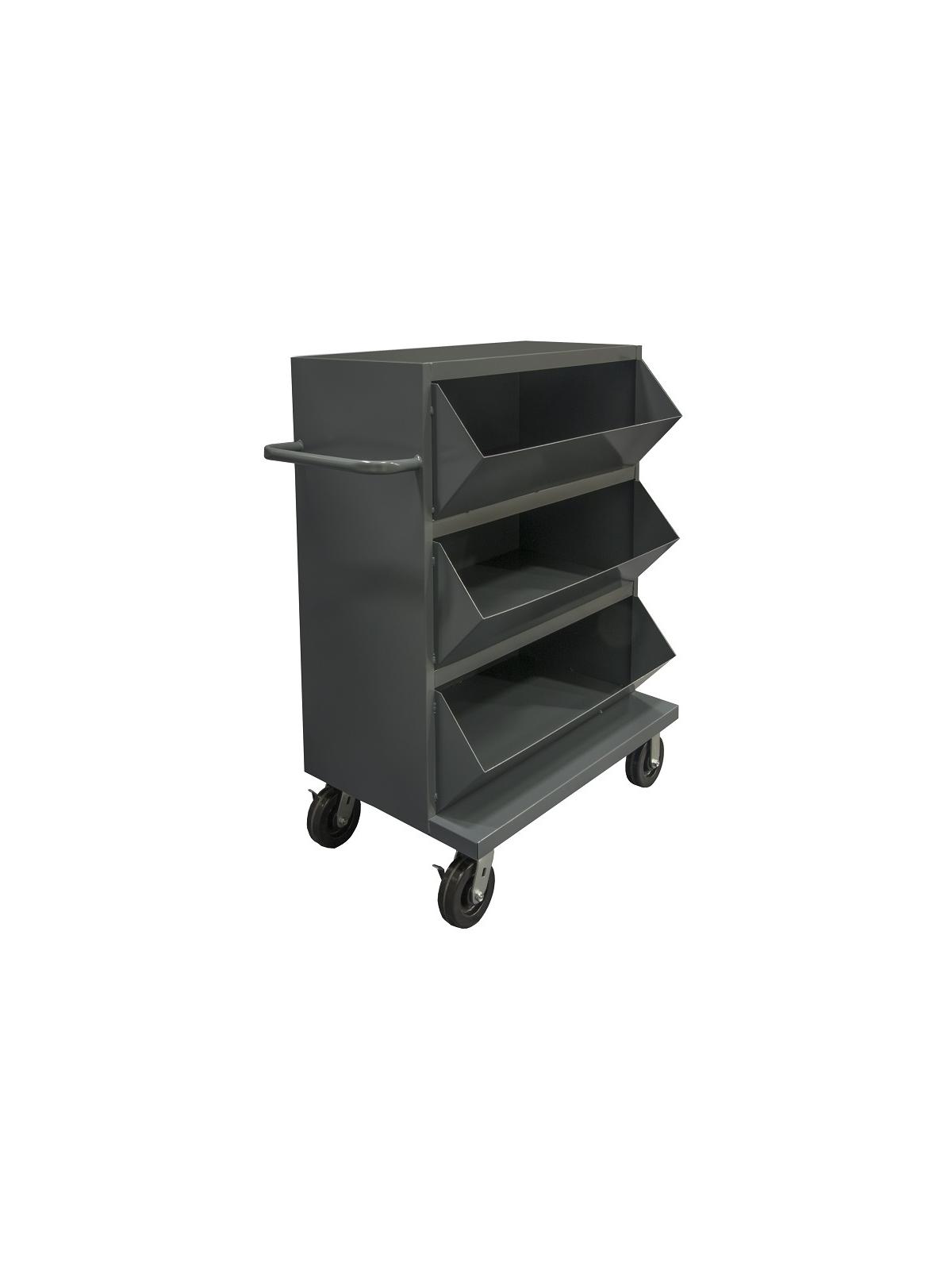 Bin opening incorporates a slope design of 6" high. Choice of 3, 6, 12, or 19 open face bins. Has 6 x 2" bolt-on phenolic casters, 2 locking swivel and 2 rigid. Sturdy, tubular push handle. Top shelf is 49-1/4" above the floor. Shelf clearance is 13-3/8". Ships fully assembled, ready to use. FOB Shipping Point.