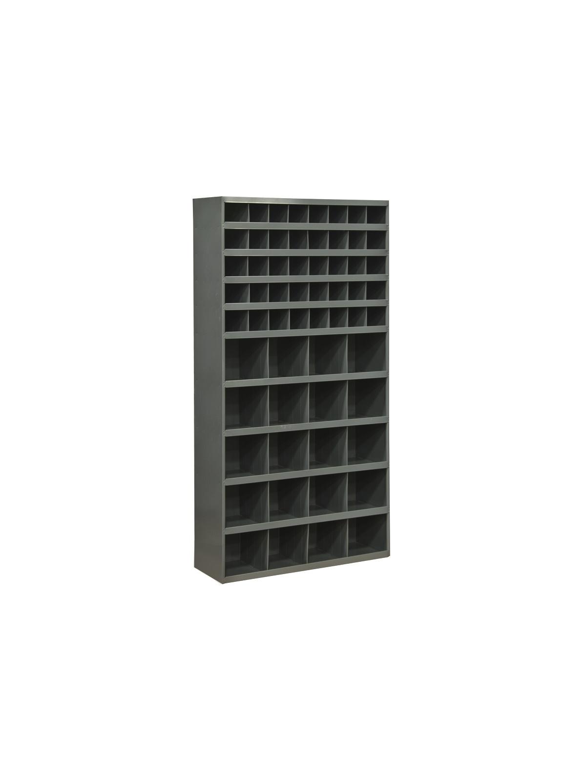 Fully hemmed 1-1/8" bin fronts to hold labels and retain parts. Roll-formed sides for increased strength and stability. Newly redesigned slope shelves. Ribbed and hemmed dividers provide added strength. Optional base and bin labels available. Ships fully assembled, ready to use. FOB Shipping Point.