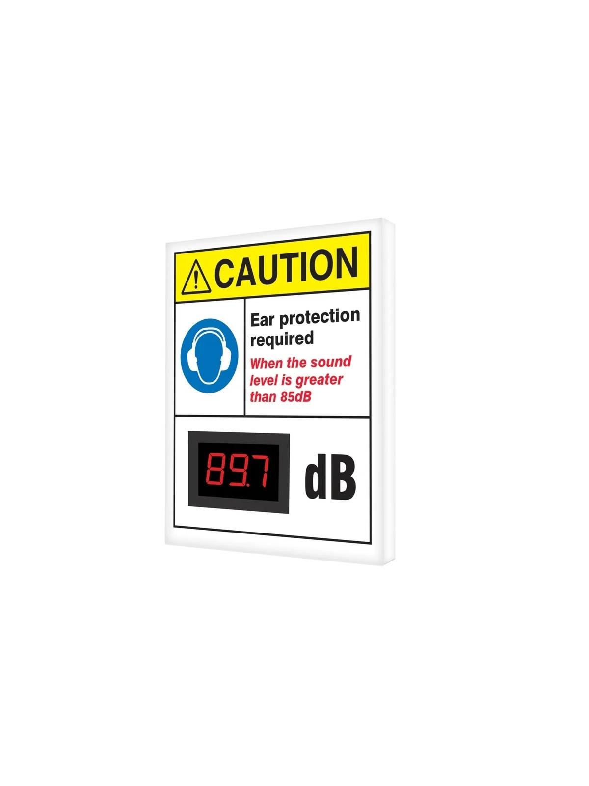 Electronic decibel meter signs constantly measure and display decibel level for employee safety. Encourage workers to use ear protection when sound levels are elevated and become a hazard to them. Striking visual edge safety sign captures employees' attention. Supports OSHA Standard 1910.95 that states employers must have in place an effective hearing conservation program whenever noise exposure equals or exceeds 85 db for 8 hours. FOB Shipping Point.