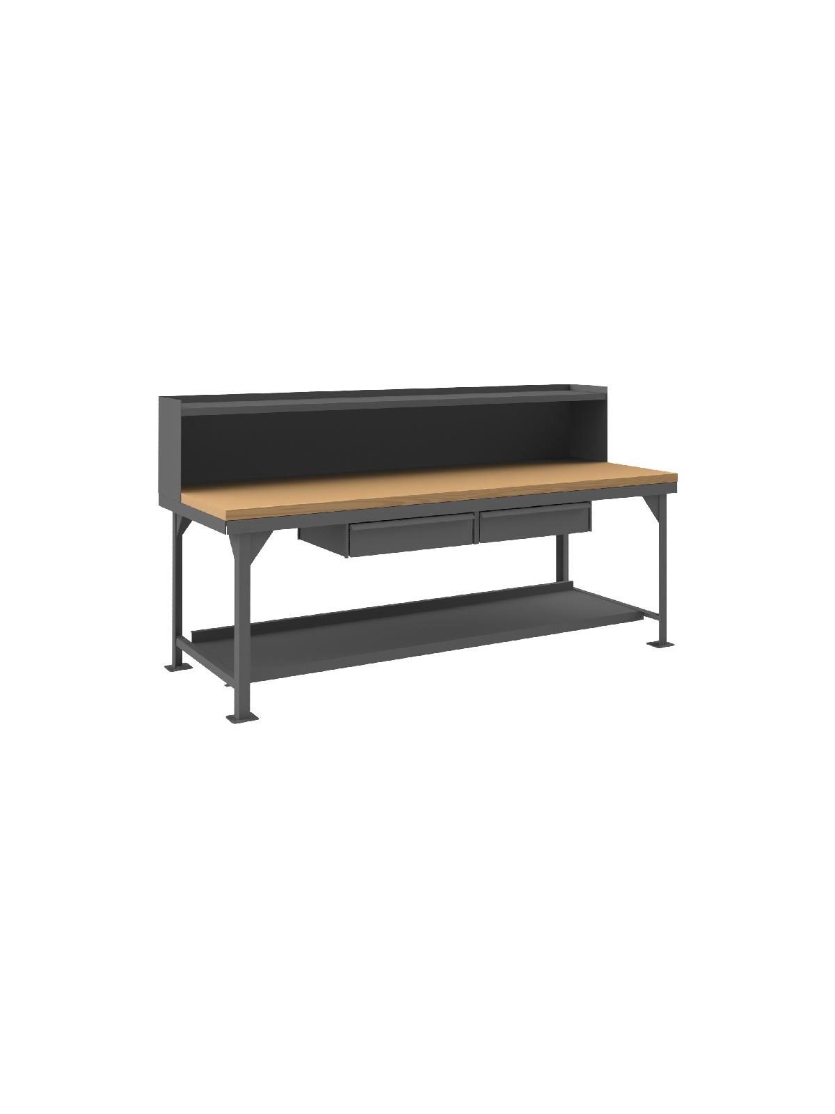 Products with top shelf risers used as shelf and back splash. See Related Items tab for Drawer for Durham Work Benches.