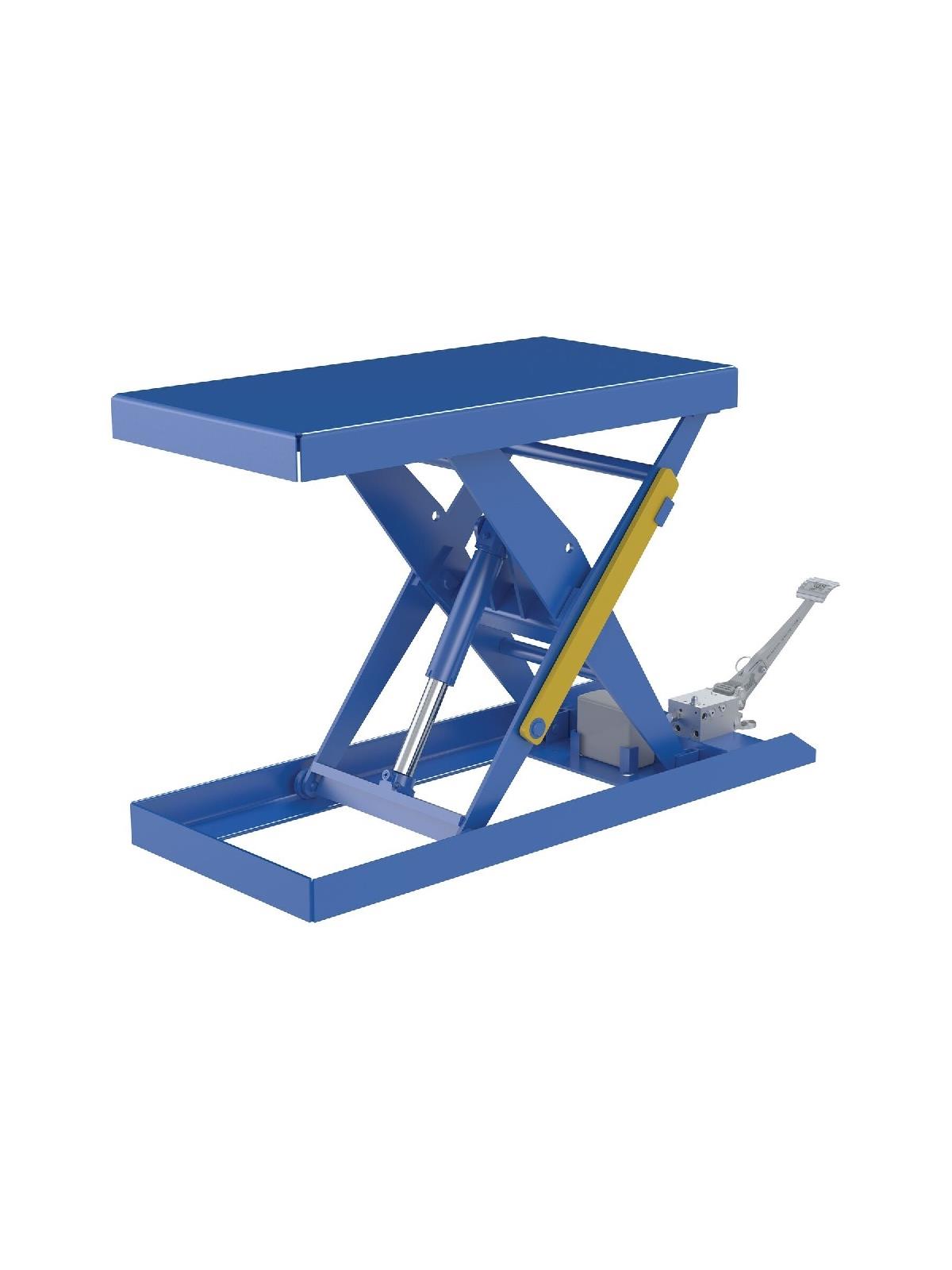 Foot Pump Scissor Lift Tables are used by all types of manufacturing and warehousing facilities. Features torsion tubes for side to side stability, pressure flow control valve for controlled lowering, and foot pump. Rugged welded steel construction. Painted blue finish. FOB Shipping Point.