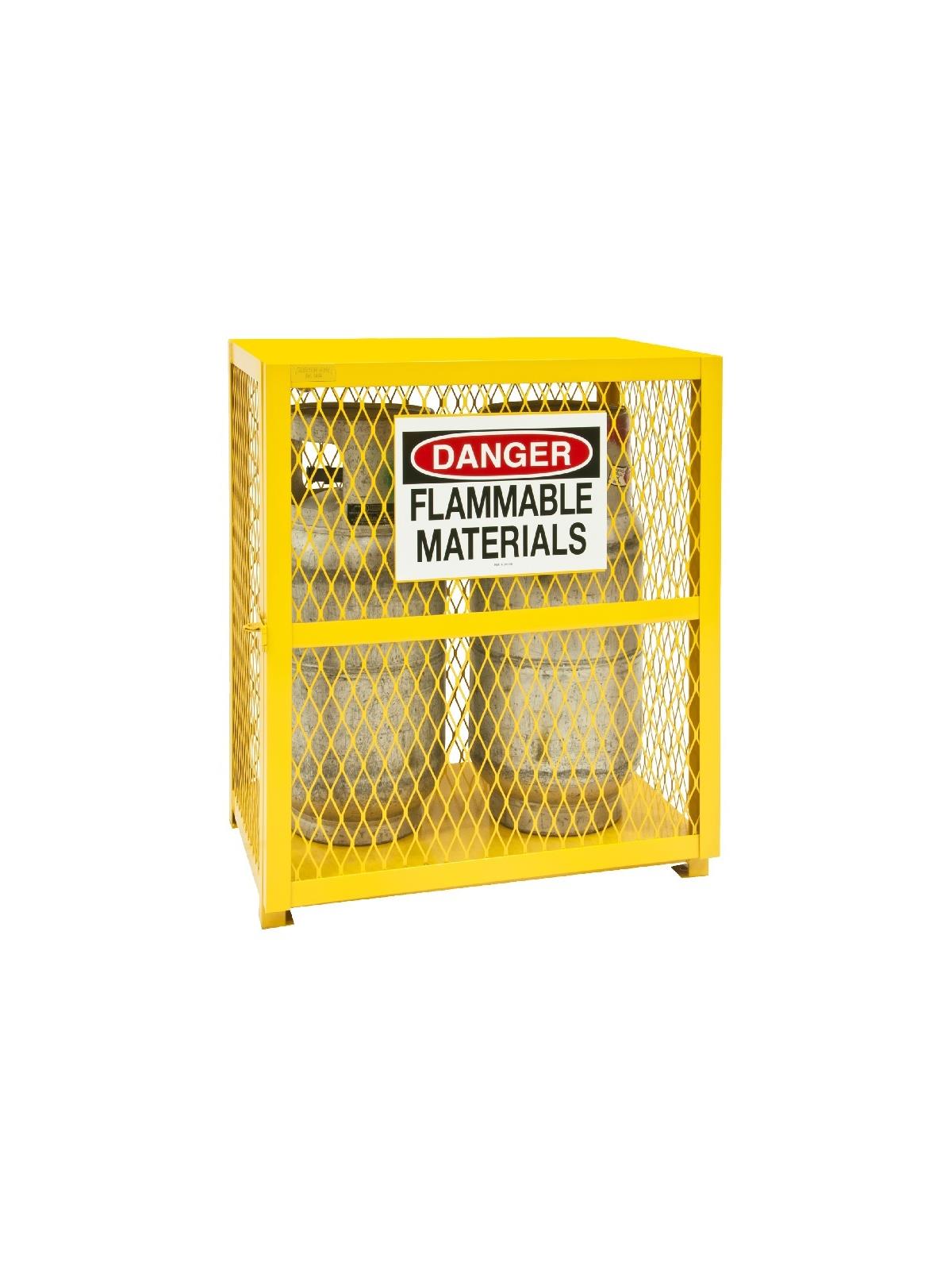 Lockable cabinets store cylinders of fuel, LP gases and other flammable materials on easy-to-access cylinder cradles. "DANGER FLAMMABLE MATERIALS" signs on each door. Magnetic catch keeps doors safely shut when not locked. Heavy-duty butt hinges keep doors from sagging. Includes padlock hasp to secure contents - padlock not furnished. Made of sturdy 1-1/2" x 1/8" angle iron frame. Pre-drilled holes for lagging to floor. Durable, rust and acid resistant safety Yellow powder coat finish. When used properly, units are in full compliance with OSHA and NFPA standards. FOB Shipping Point.