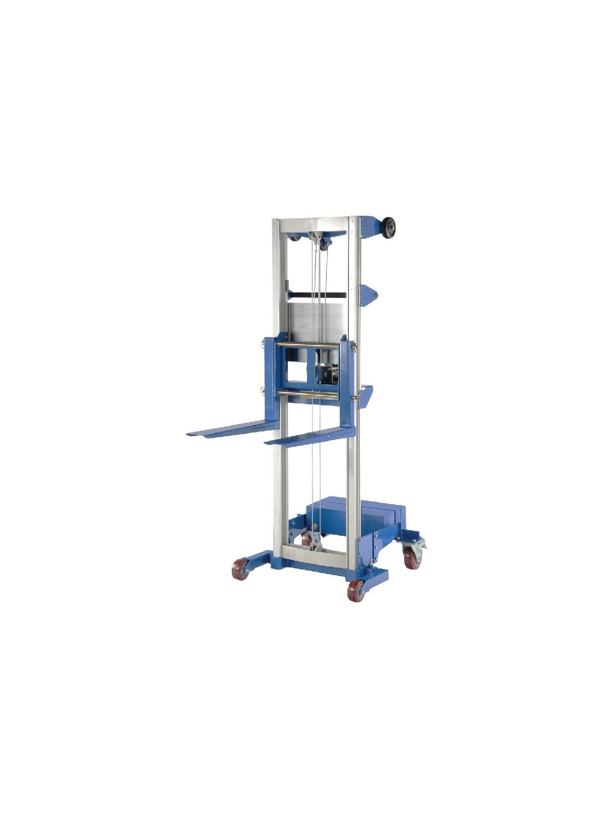 Operated by a hand-crank winch that features a reversible handle and a hold-down device for securing the carriage during transport. Forks can be inverted to provide 2 different heights. Rugged thick steel forks are 4"W x 1-3/4" thick and forks measure 20-1/2"W x 22"L overall. Truck is made of durable steel-and-aluminum. Two 8" non-marking rear wheels, two 2" front swivel casters. Counter balanced design has poly-on-poly wheels, (2) 5" rear swivel wheels, (2) 4" front wheels. Models ending with 'HP' and 'EHP' suffixes have extended height capabilities. These units have a 2 stage mast system and a telescoping inner mast frame, giving the user the ability to extend the forks above the height of the first mast. FOB Shipping Point.