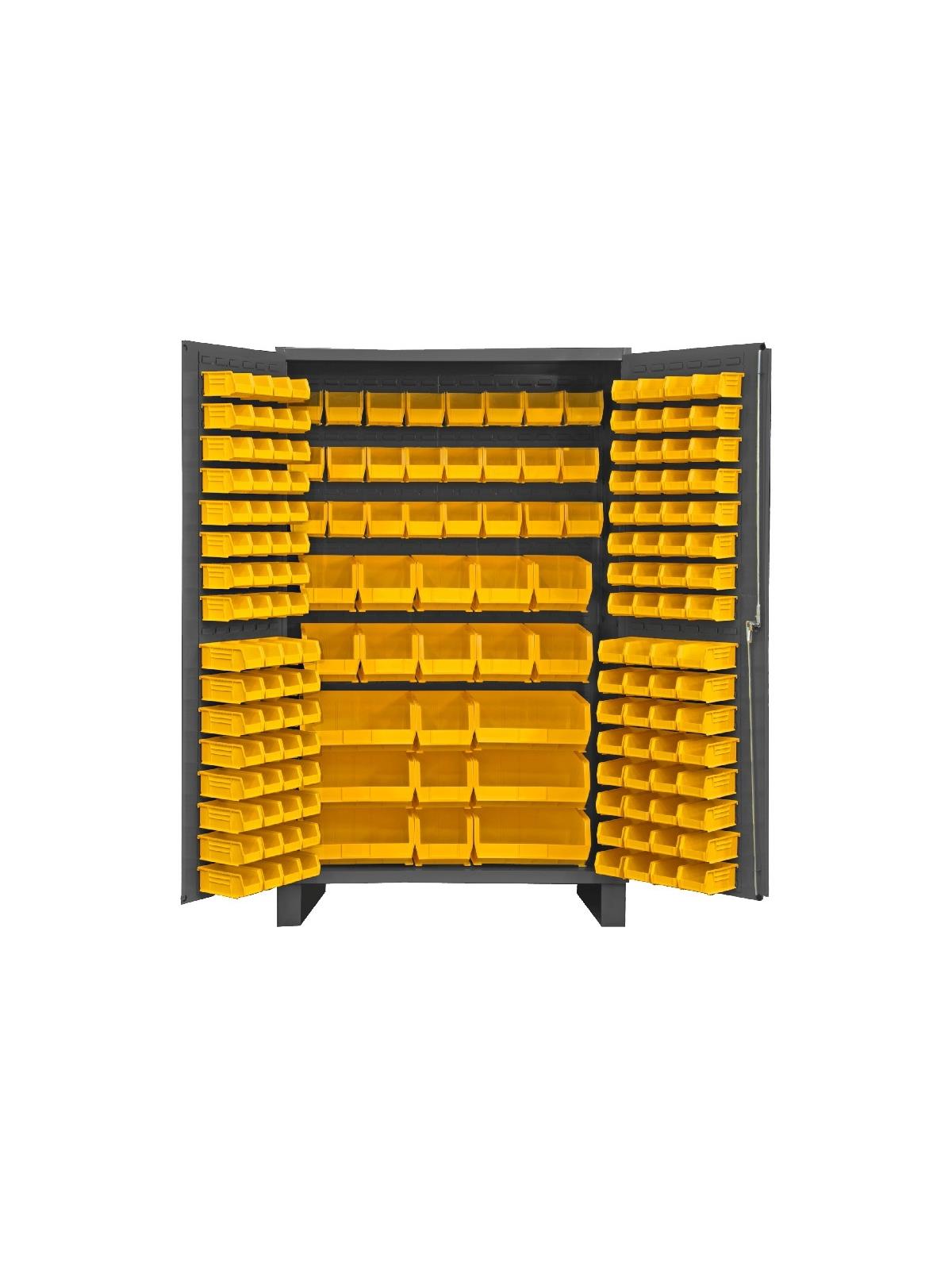 Heavy-duty, all welded 14 gauge steel construction. 3-point locking handle with 5/16" dia. rods and a provision for padlock. Models HJC-171, HSSC-227, and HSSC-185-3S have 6" high box style legs which offer space for lift truck forks making the entire units forkliftable and can be lagged to the floor. Legs are constructed of 3/16" steel. All cabinets feature heavy-duty leaf hinges to prevent warping and sagging. Fully loaded doors can hold up to 650 lbs. Finished in durable Gray powder coat. FOB Shipping Point.