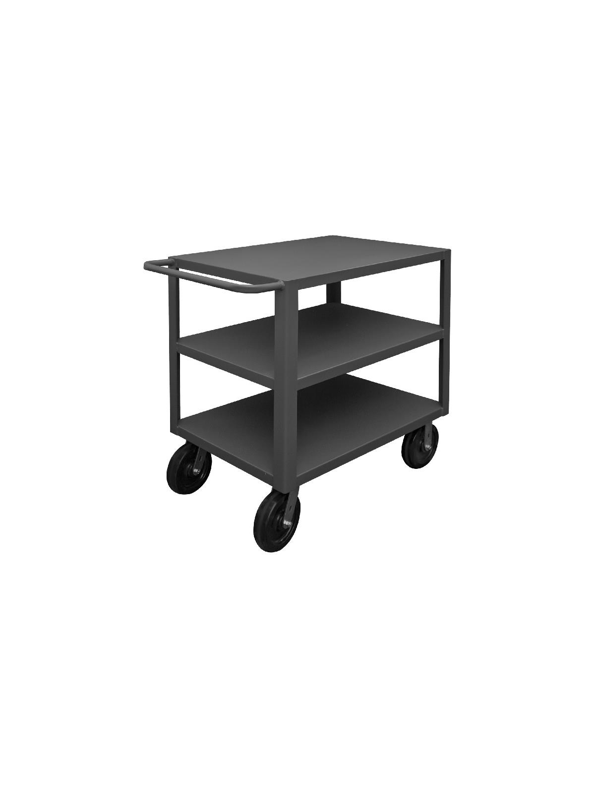 Heavy Duty Portable Tables have a 2" x 3/16" angle iron frame for added strength. Shelves are reinforced and have lips down. (2) swivel and (2) rigid bolt-on casters. Sturdy tubular push handle for easy maneuverability. 4,000 lbs. capacity unit has welded 14 gauge steel shelves with channel formed sides. 5,000 lbs. capacity unit has welded 12 gauge steel shelves. FOB Shipping Point.