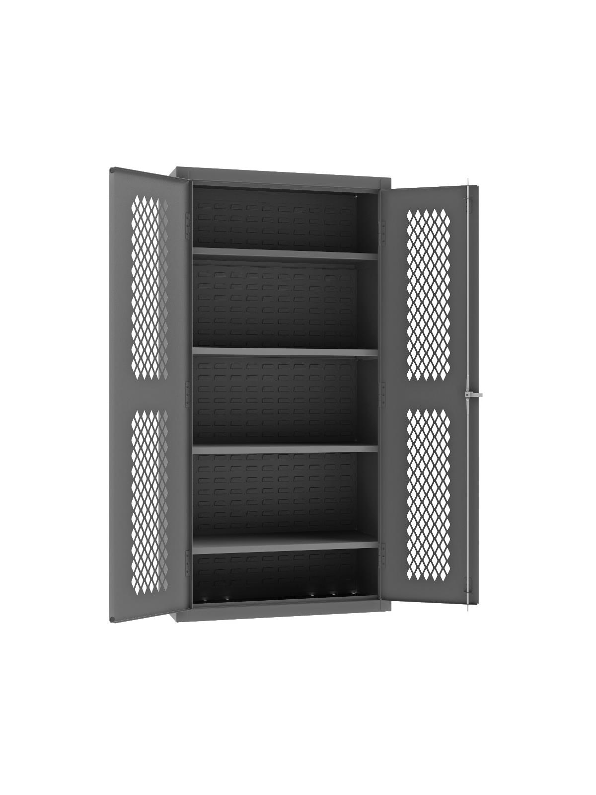 Punched diamond pattern in doors allows content visibility and ventilation. 3-point locking system with keyed handle and lock rods. 4 keys included. Full height, formed and recessed doors with heavy duty, leaf hinges to prevent sagging and warping. Adjustable shelves rest on louvered uprights and adjust on 4" centers (no tools required). Durable, gray, textured powder coat finish. FOB Shipping Point.