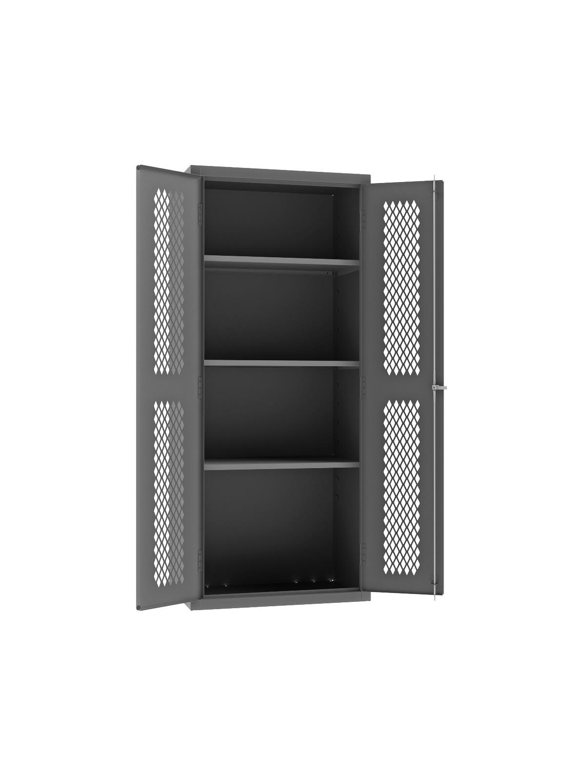 Punched diamond pattern in doors allows content visibility and ventilation. 3-point locking system with keyed handle and lock rods. 4 keys included. Full height, formed and recessed doors with heavy duty, leaf hinges to prevent sagging and warping. Adjustable shelves rest on louvered uprights and adjust on 4" centers (no tools required). Durable, gray, textured powder coat finish. FOB Shipping Point.