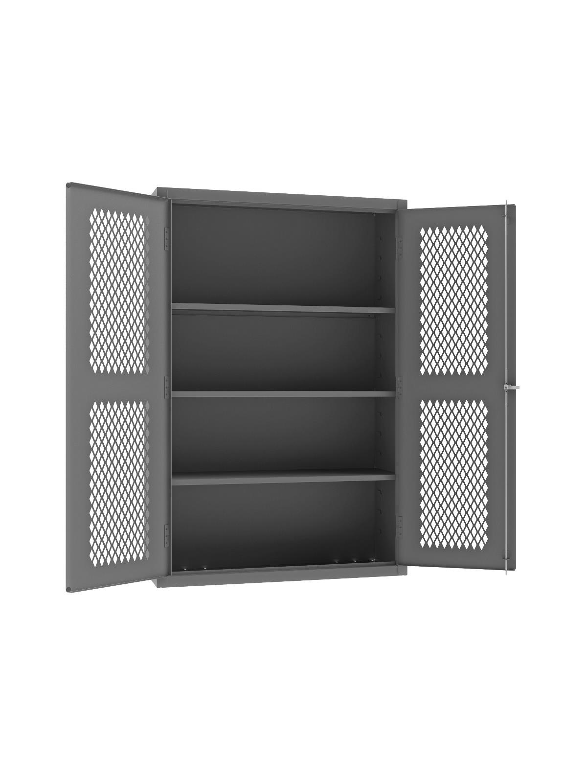 Punched diamond pattern in doors allows content visibility and ventilation. 3-point locking system with keyed handle and lock rods. 4 keys included. Full height, formed and recessed doors with heavy duty, leaf hinges to prevent sagging and warping. Adjustable shelves rest on louvered uprights and adjust on 4" centers (no tools required). Durable, gray, textured powder coat finish. FOB Shipping Point.