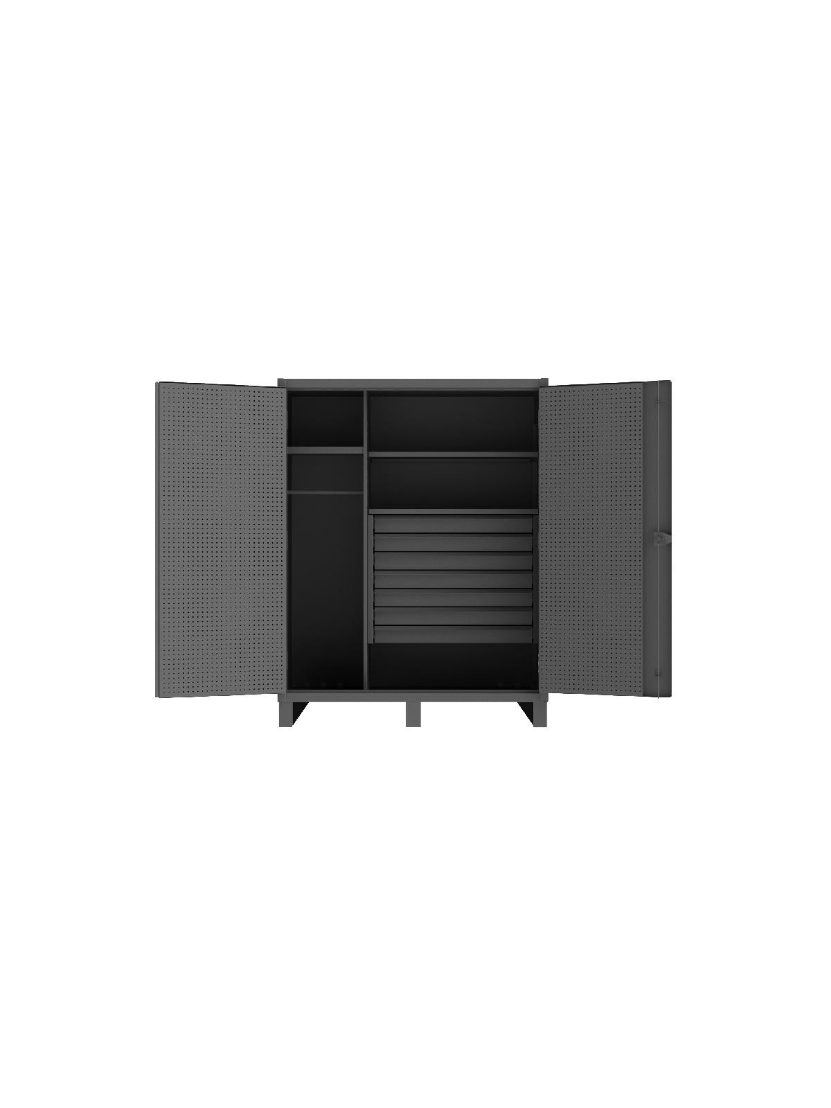 Shelves bolt into place easily using fasteners provided and adjust on 2-1/4" centers. 3-point locking systems with pad-lockable cast steel locking handle (pad-lock not included). Pegboard holes are punched on 1" centers and accommodate standard peg hooks. 14 gauge steel pegboard are welded to both doors. 6"H base/legs which provide access for forklifts; prepunched holes allow for lagging to the floor. Doors open at 180° for full access to product. Bearing slide drawers glide smoothly and have a 400 lb. capacity. Ships fully assembled. Durable, textured, gray powder coat finish. FOB Shipping Point.