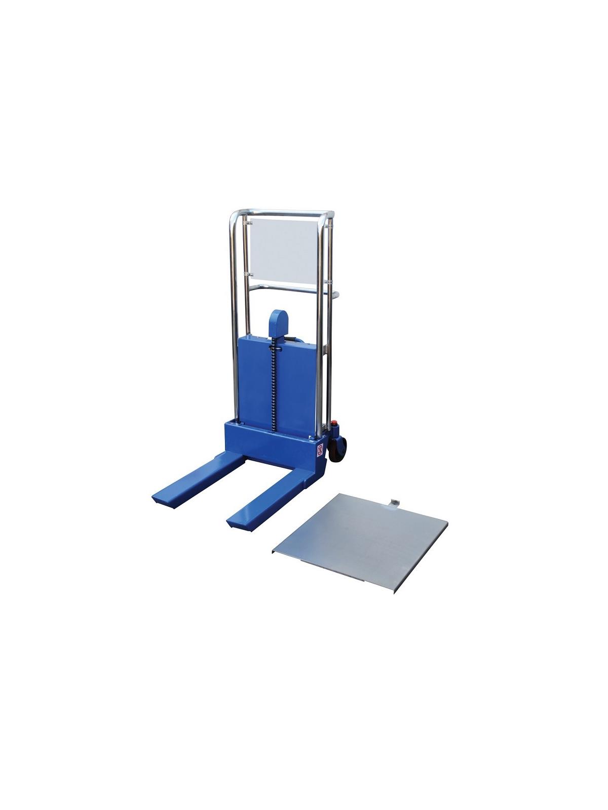 Economical and attractive. Features removable chrome platform for operations requiring forks. Manual hydraulic pump mechanism yields 3/4" of platform travel per stroke. Non-slip chain is used for accurate positioning. Units roll easily on 2 rigid, 2 swivel polyurethane casters and includes a foot operated brake for extra safety. All welded steel construction with chrome platform and uprights. Forks measure 4-3/8"W. x 2-1/2"H. -- fork length is same as platform length. Not for use with pallets. FOB Shipping Point.