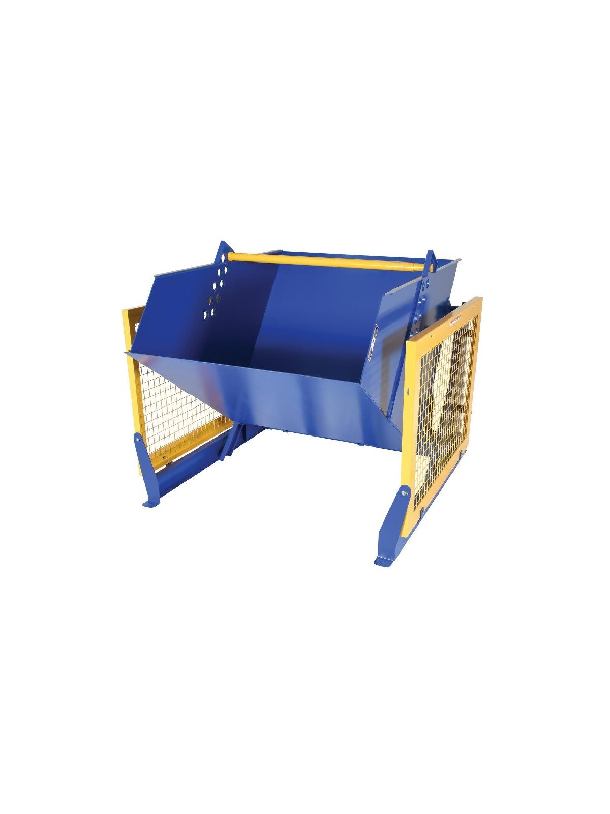 This ultimate dumper has advanced features from solid all welded steel construction to the Emergency Brass Velocity fuse in the cylinder. Main components include a 24V hand held pendant control, 56 frame motor, upper travel limit switch to reduce wear on the components. Safety features include: side rail guards, floor hold down brackets, adjustable hold down bar, 3,000 psi hydraulic component rating, integrated brass velocity fuse mounted inside the cylinder. Maximum rotation is 135°, yielding a 45° dump angle. Painted Royal Blue. FOB Shipping Point.