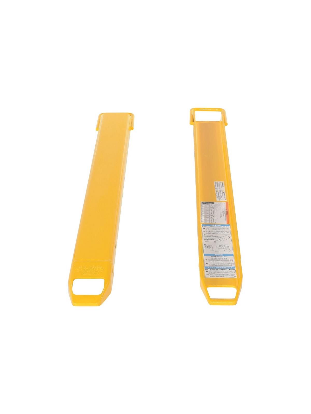 Rugged and durable welded steel construction with cast steel fork tips. Steel retaining strap prevents fork extensions from sliding off forks during use. Extensions are put on by sliding them up the fork at a 45° angle. OSHA regulations require that extensions are no more than 150% of the existing fork length. Powder coat Yellow finish. FOB Shipping Point.
