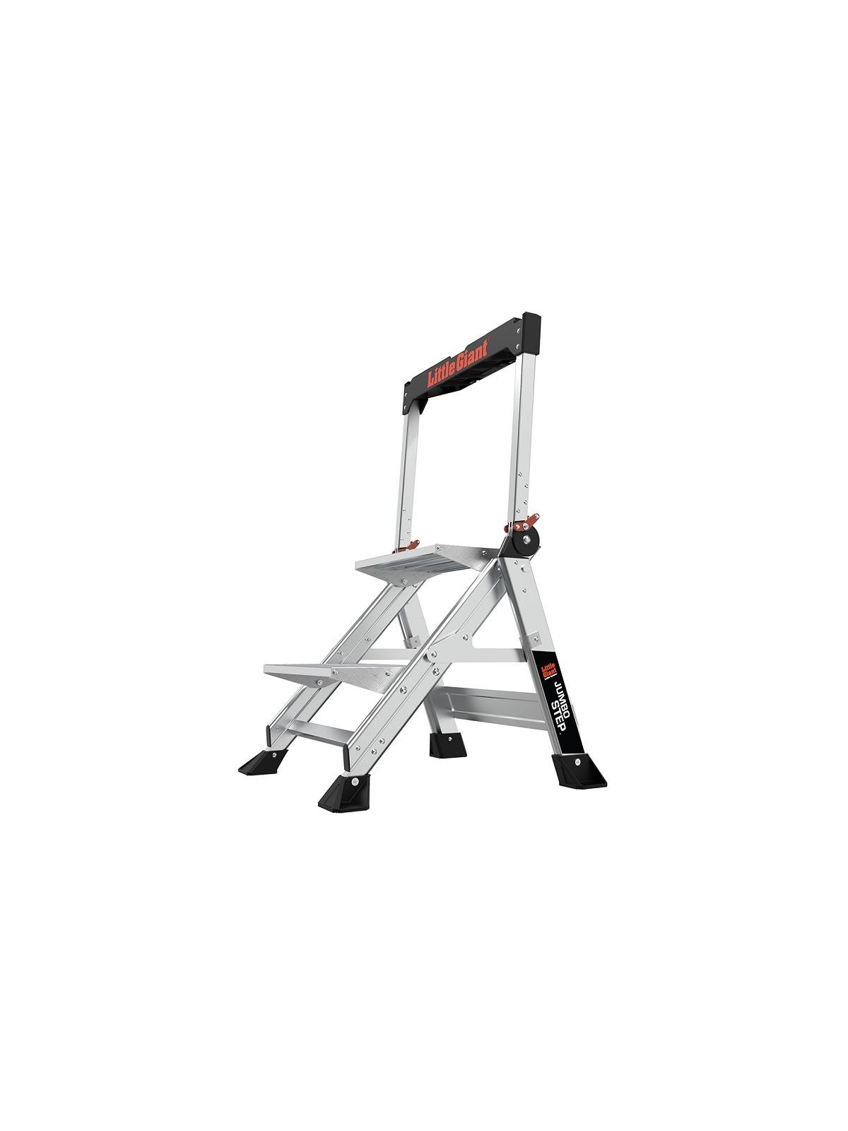 The Little Giant® Jumbo Step Safety Stepladder is the ultimate combination of lightweight, stability and strength. The Jumbo Step's 8-1/2" wide, slip resistant treads and stair-like design provide unmatched comfort and stability. It is ideal for jobs that require both frequent climbing up and down, as well as those that require long periods of standing. This design makes working at heights as comfortable as standing on the ground. The patent pending Jumbo Step operates easily and is simple to store with its slim 4-1/2" storage depth. Its large nonslip footpads provide great traction over almost any surface. Stands up to professional and industrial use and is rated to hold up to 375 lbs. FOB Shipping Point.