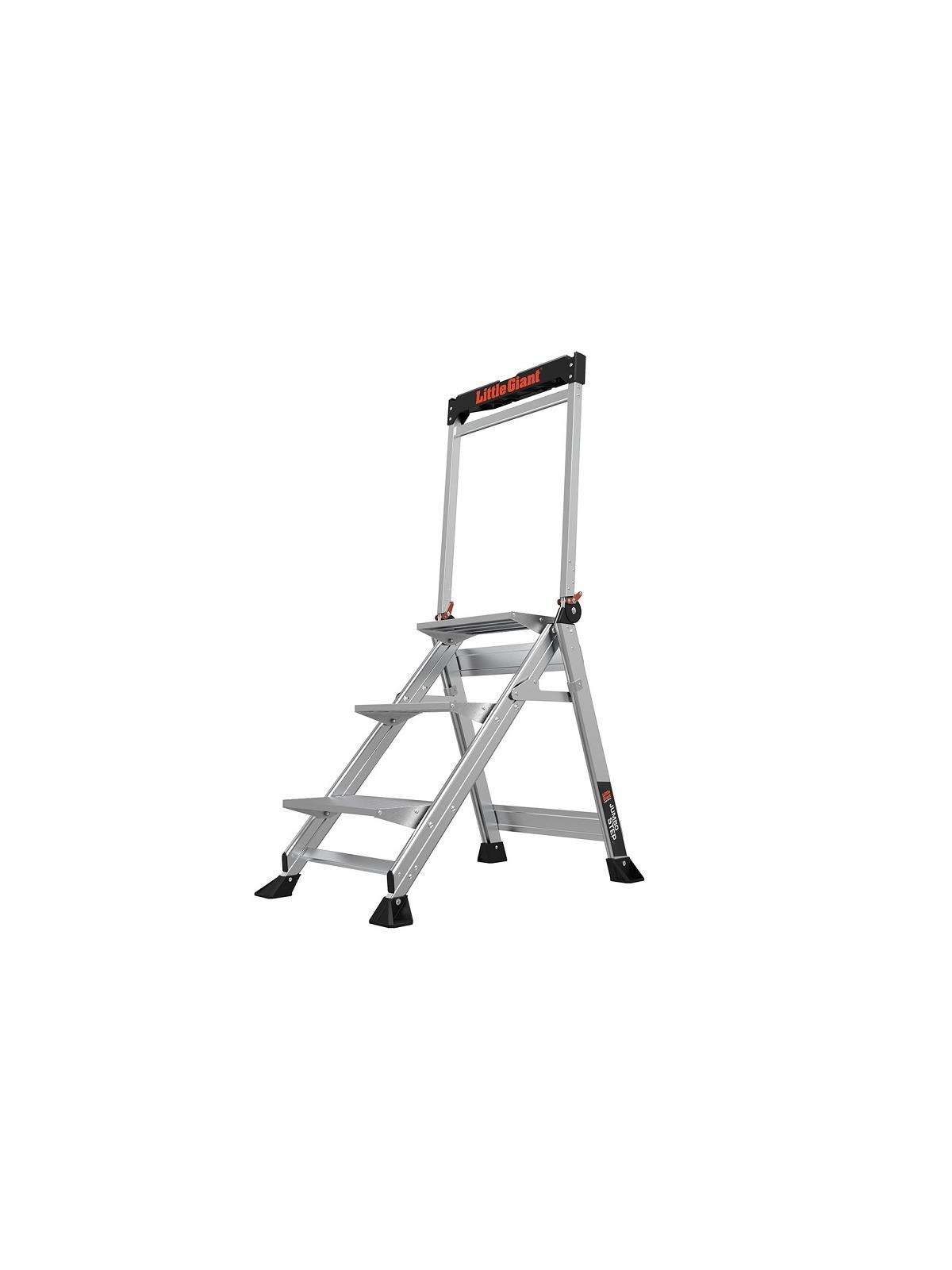 The Little Giant® Jumbo Step Safety Stepladder is the ultimate combination of lightweight, stability and strength. The Jumbo Step's 8-1/2" wide, slip resistant treads and stair-like design provide unmatched comfort and stability. It is ideal for jobs that require both frequent climbing up and down, as well as those that require long periods of standing. This design makes working at heights as comfortable as standing on the ground. The patent pending Jumbo Step operates easily and is simple to store with its slim 4-1/2" storage depth. Its large nonslip footpads provide great traction over almost any surface. Stands up to professional and industrial use and is rated to hold up to 375 lbs. FOB Shipping Point.