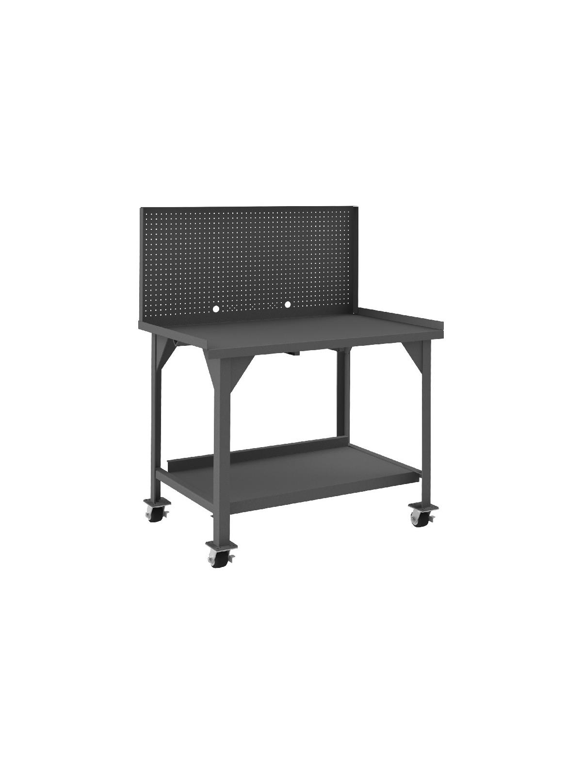 Workbench top is 12 gauge thick reinforced steel. Has angle iron stiffener under work surface and 2" x 2" x 1/4" angle iron legs. Mobile units (DWBM) include (4) 3" phenolic, locking swivel casters. Back and end stops. All units have provisions for optional drawer to be added. Work surfaces are 34" above the floor. All models include a 12 gauge steel lower shelf with 500 lbs. capacity. Foot pads with predrilled holes allow for lagging to the floor. FOB Shipping Point.
