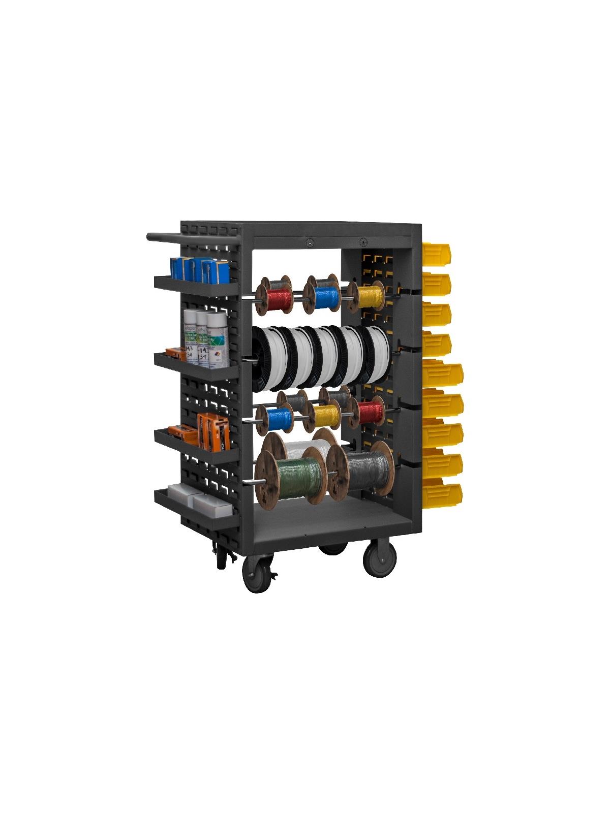 Heavy duty, all welded 14 gauge steel construction. Total capacity of 1,200 lbs. 1-1/2" lip on top of work surface prevents parts from falling off during transport. Louvered panels on 2 ends, accommodate Hook-On Bins® and metal Hook-On Trays (Bins and Trays sold separately). Heavy duty handle makes transport easy, adds 6" to overall width of cart. (8) 23" removable rods accommodate wire spools. 7-1/2" between rods, larger spools can be accommodated if some rods are removed. Recessed rods allow protection of spools during transport. 4 wire guides hang below the work surface for ease in cutting wire. (4) 5" x 1-1/4" polyurethane bolt on casters, (2) rigid and (2) locking swivel. FOB Shipping Point.