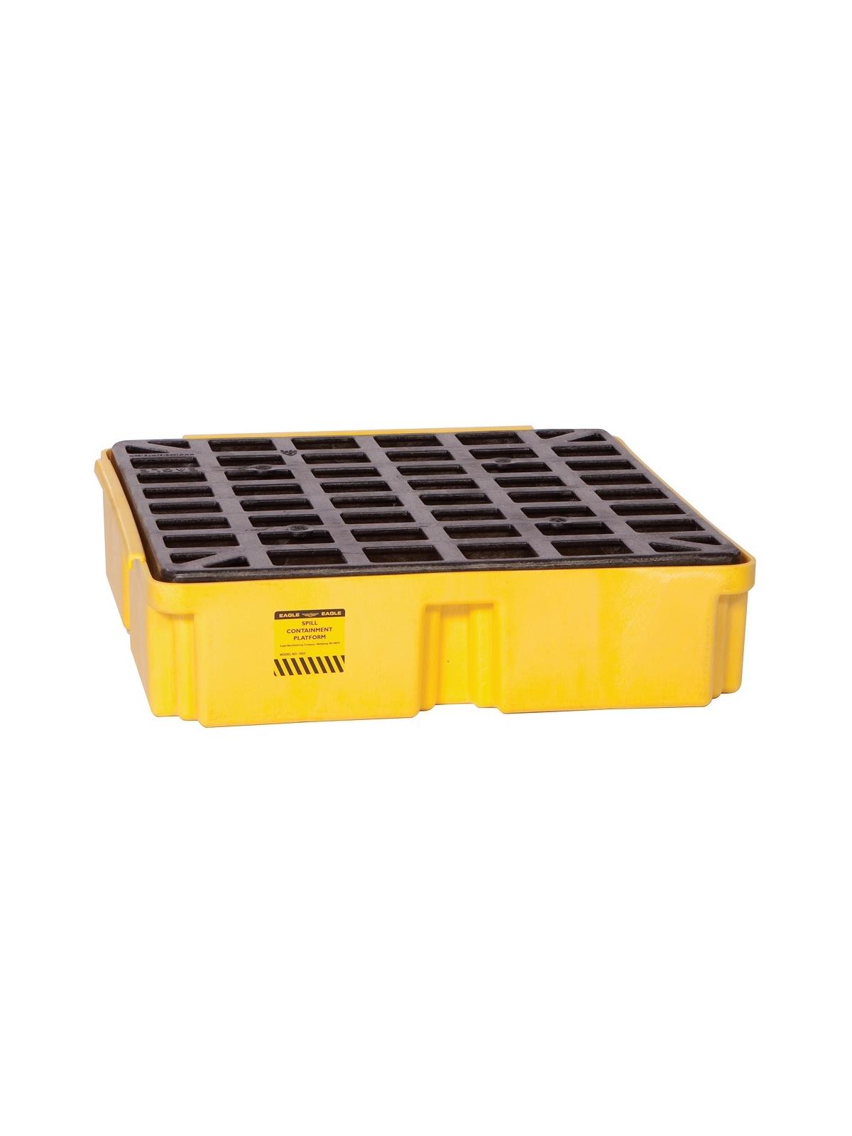 Eagle Spill Containment Modular Platforms are constructed of yellow or black density polyethylene (HDPE) for excellent durability and chemical resistance. Features a sump capacity between 15 and 121 gallons, measures only 6.5" high and has black HDPE flat top grating which removes easily for cleaning. Forkliftable design (except 1633 varieties). All Meet EPS 40 CFR 264.175 and most are SPCC Compliant. FOB Shipping Point.