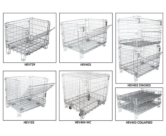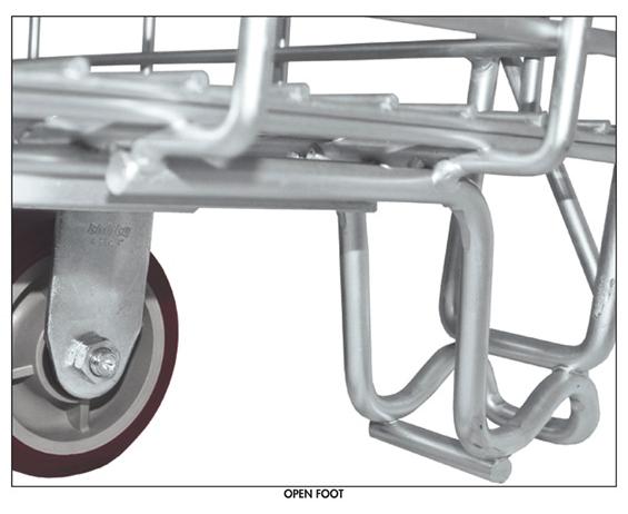 Containers are collapsible and stackable. Can be stacked 4 high fully loaded with product. Two styles of stacking feet, open foot or closed foot. Available with or without casters. Wire material is electronic plated for long life. No minimum order. FOB Shipping Point.