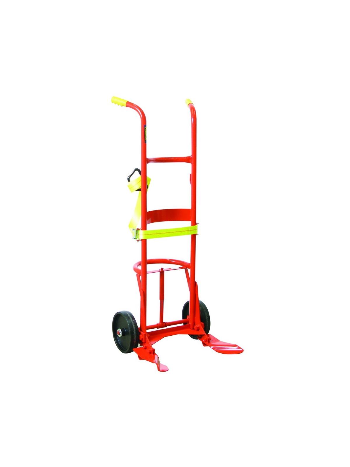 Recommended primarily for handling of 85 gallon overpacks. Long belt allows truck to handle all poly drums. Replaceable "feet" and belt. Wide "feet" and belt eliminate the risk of drums being punctured by nose prongs and chime hooks. Floating axle reduces effort required to break over and balance the load. 23.5"D. Patented design.
