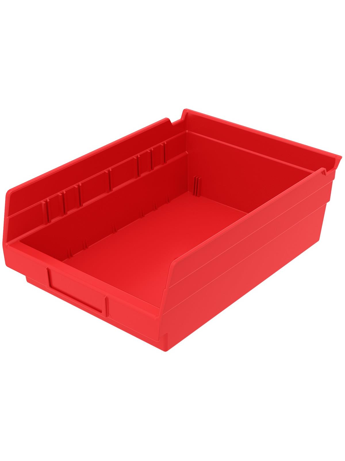 Outlasts corrugated bins - pays for themselves in reduced replacement costs. One-piece construction is waterproof and unaffected by grease or oil. Works with 12", 18" and 24" deep shelving, or vertical storage and retrieval units. Labels available. Available in 22 sizes and five colors - Red, Yellow, Blue, Green, or Semi-Clear. FOB Shipping Point.